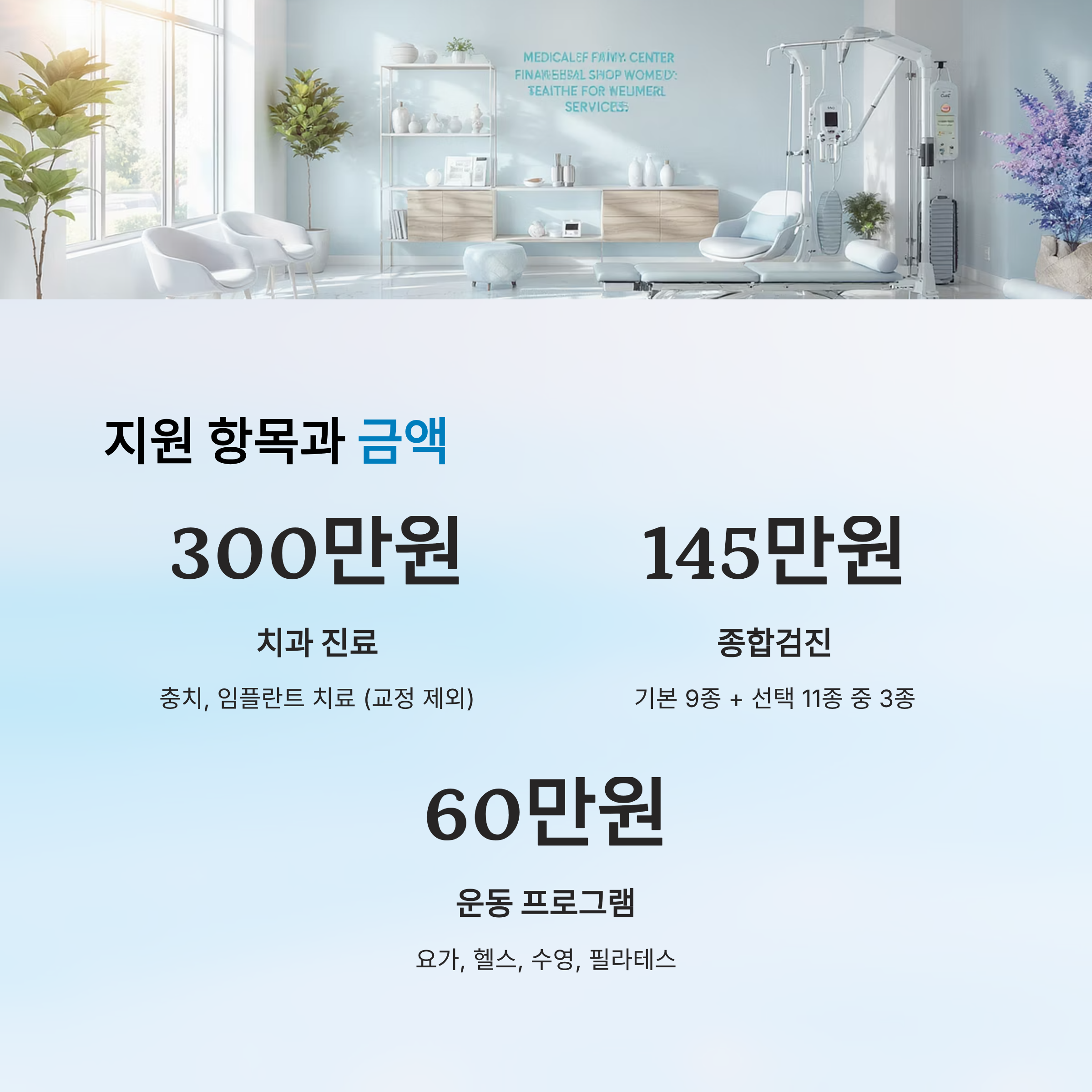 - 지원금액 → 치과 최대 300만 원 / 종합검진 최대 145만 원 / 건강증진 프로그램 최대 60만 원