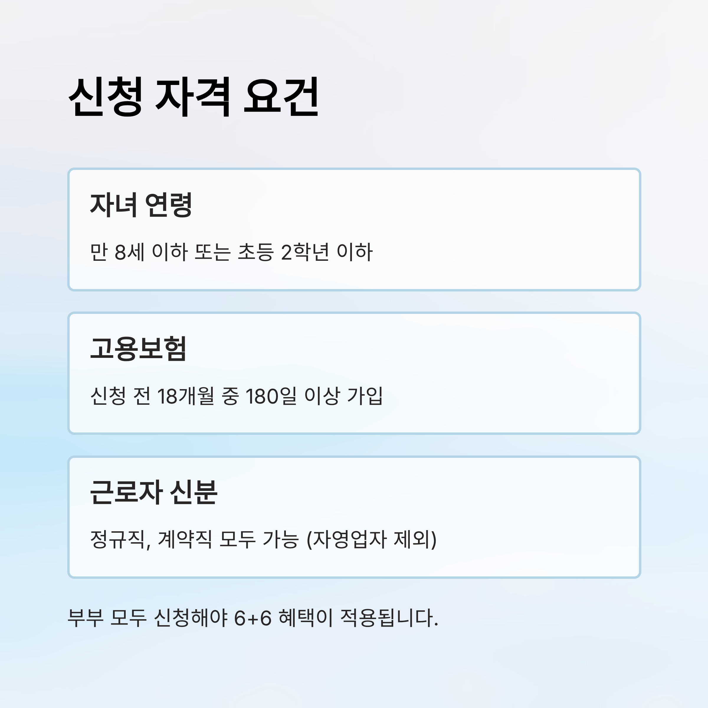 이처럼 조건을 충족하는 것은 생각보다 까다롭지 않지만, 사소한 요건을 놓치면 신청이 반려될 수 있어요. 따라서 반드시 고용보험 납부 이력, 자녀 나이, 부부 근로 여부를 꼼꼼하게 확인해 두는 것이 중요해요. 📌