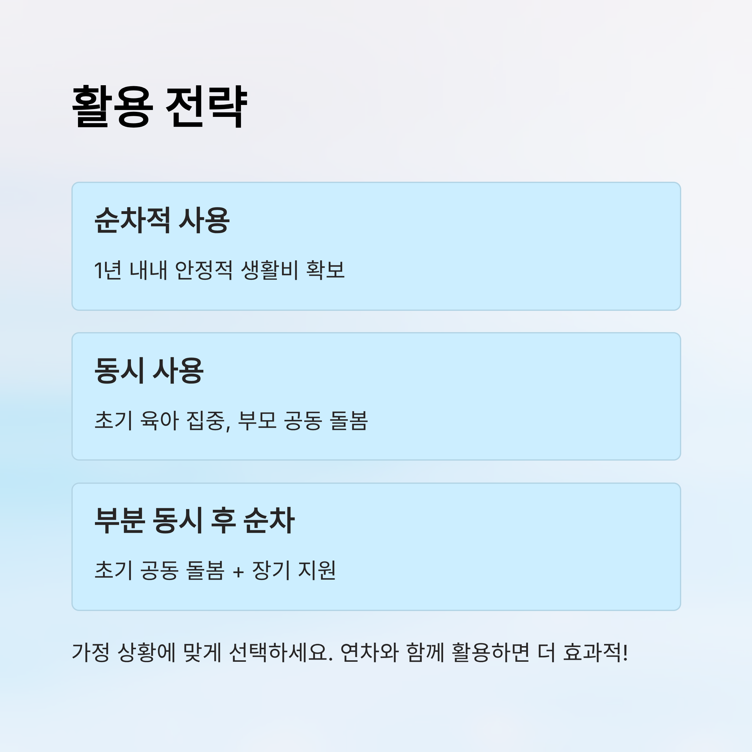 | 순차적 사용 | 1년 내내 안정적 생활비 확보 | 한쪽 부모만 아이 돌봄 | 경제적 안정 중시 |