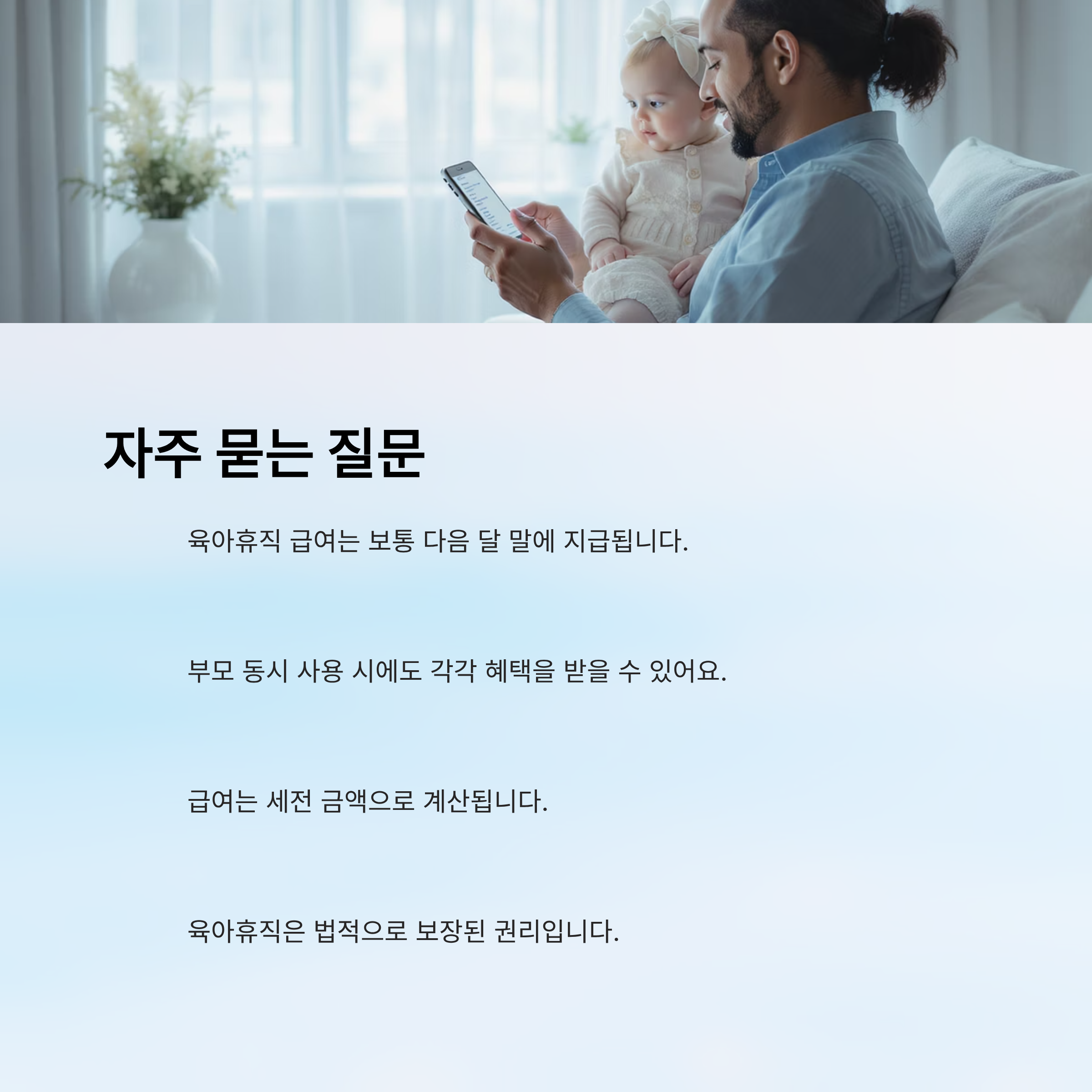 그동안 제도의 변화는 단순히 금액을 올리는 것에 그치지 않고, 부모가 경력 단절에 대한 두려움 없이 아이와 시간을 보낼 수 있도록 돕는 방향으로 진화해 왔어요. 이제는 회사도 육아휴직을 자연스럽게 받아들이는 분위기가 형성되고 있다는 점이 큰 차이라고 할 수 있어요. 👍