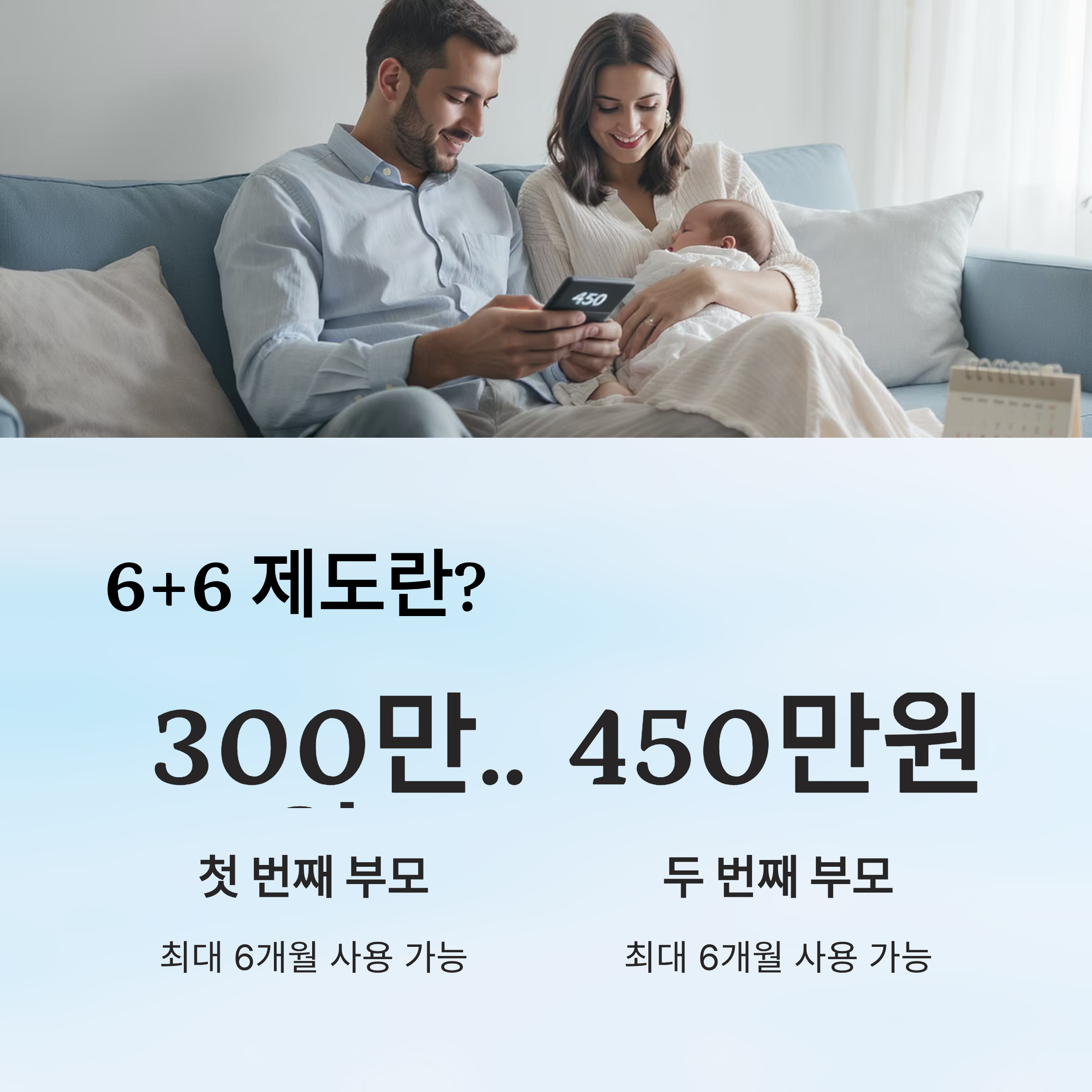 | 첫 번째 부모 | 기존 방식과 동일 지급 | 월 300만 원 | 최대 6개월 |