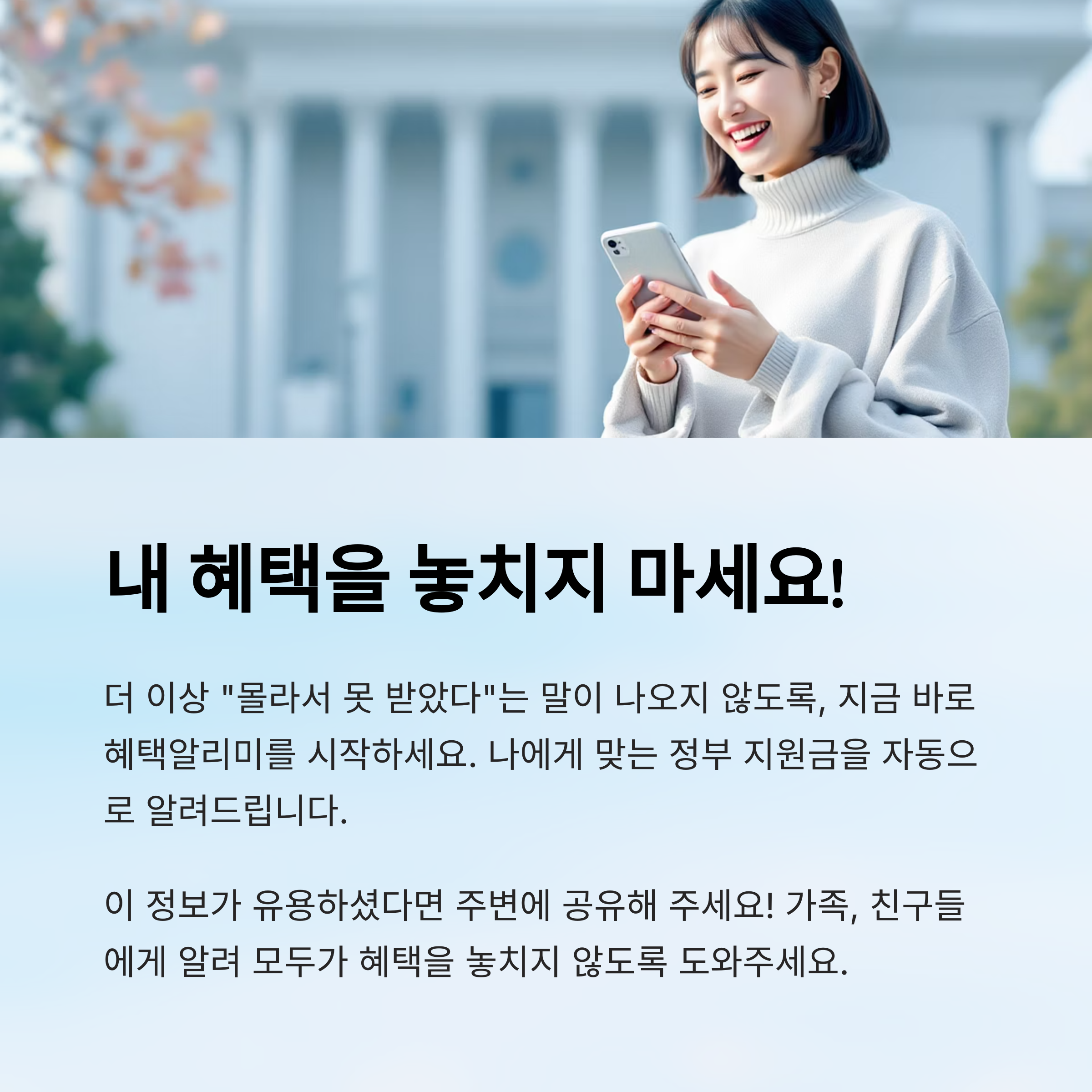 이제는 일일이 검색하지 않아도, 내게 꼭 맞는 혜택을 알아서 챙겨주는 '혜택알리미'가 있어서 든든하답니다! 2025년, 여러분의 삶을 확 바꿔줄 혜택 정보, 함께 알아봐요. 💡