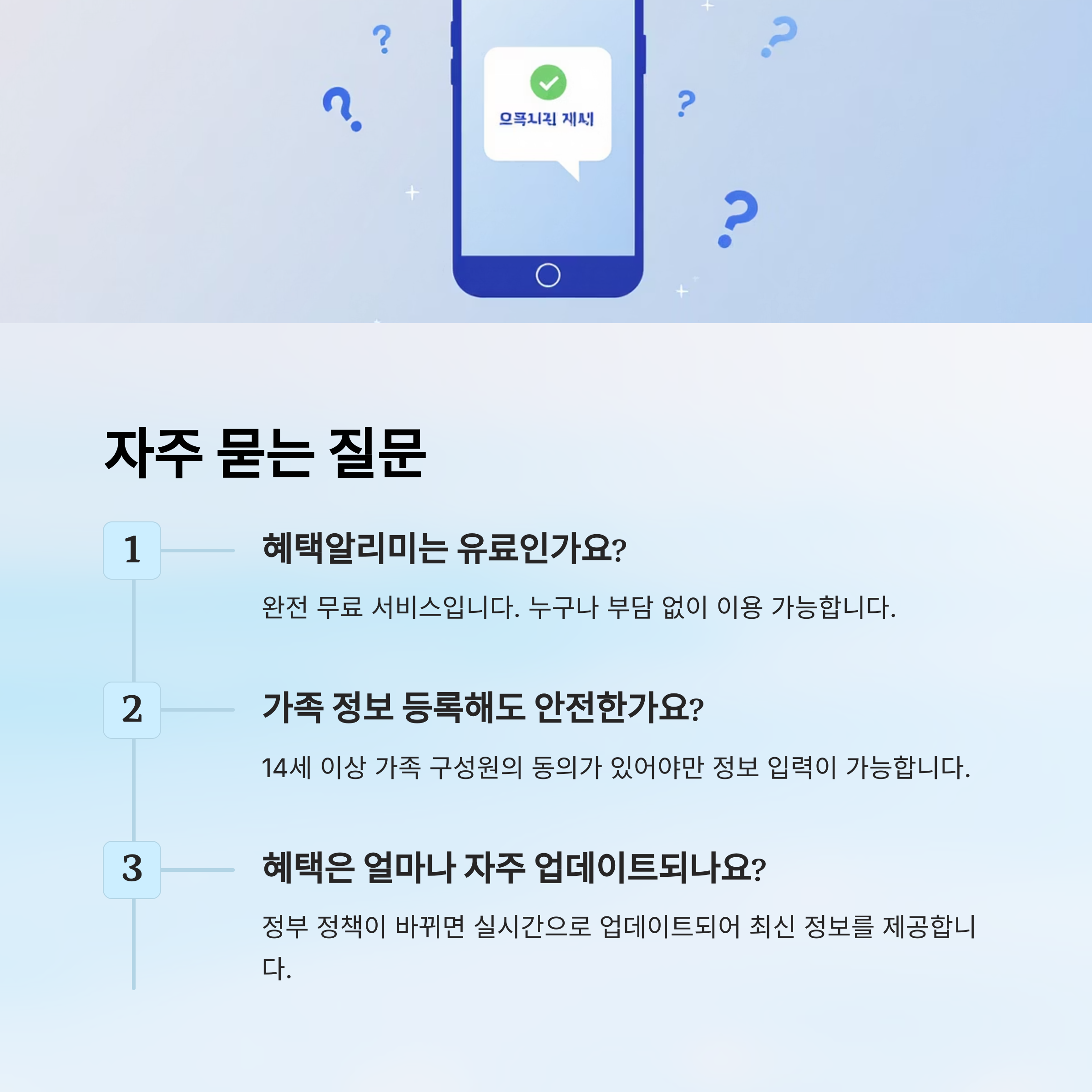 A4. 전혀 아니에요! 혜택알리미는 완전 무료 서비스예요. 부담 없이 누구나 이용할 수 있어요. 💯