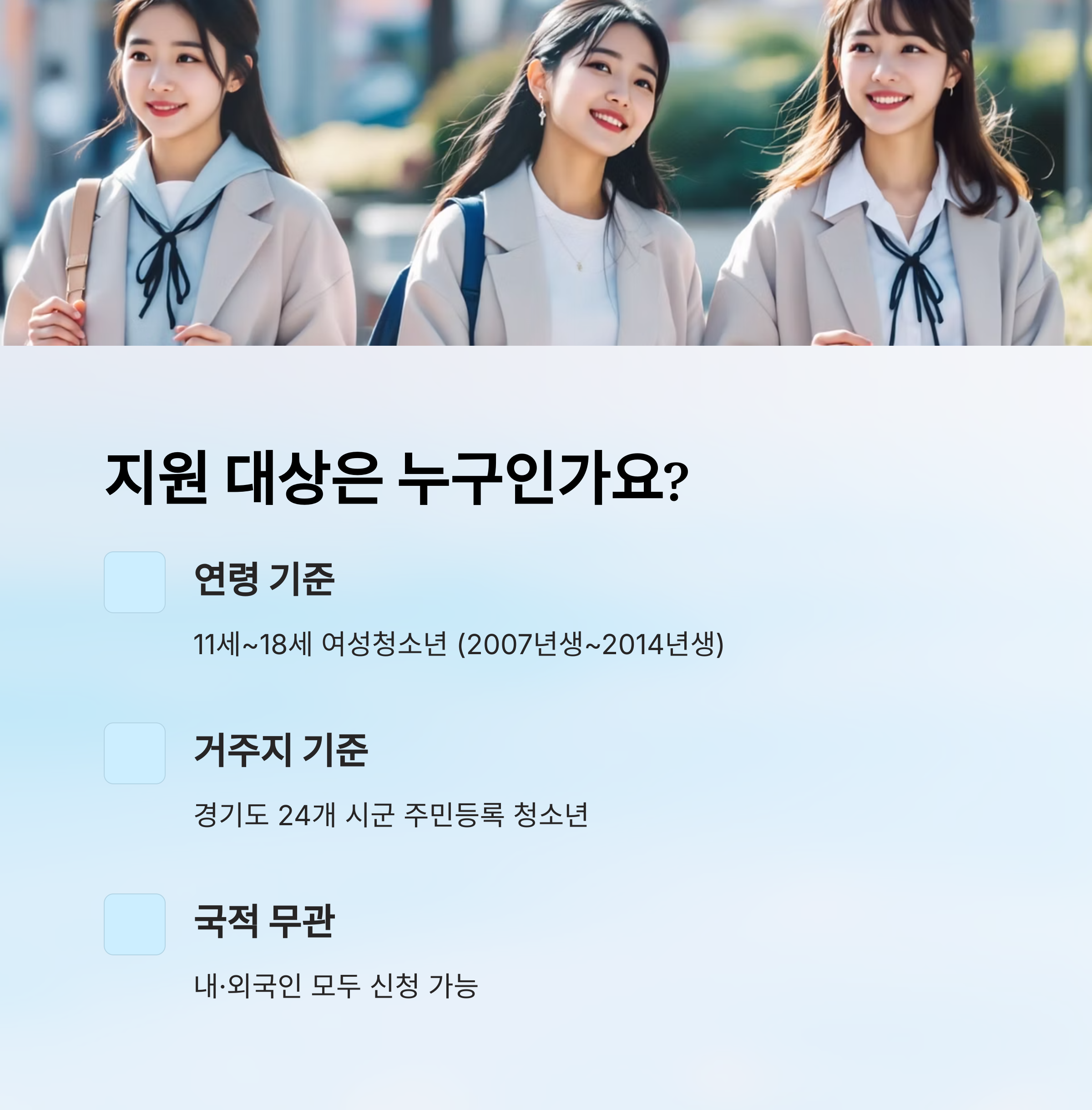 대상 연령은 2007년생부터 2014년생까지이며, 주민등록상 경기도 24개 시군에 주소지를 둔 청소년이 해당돼요.