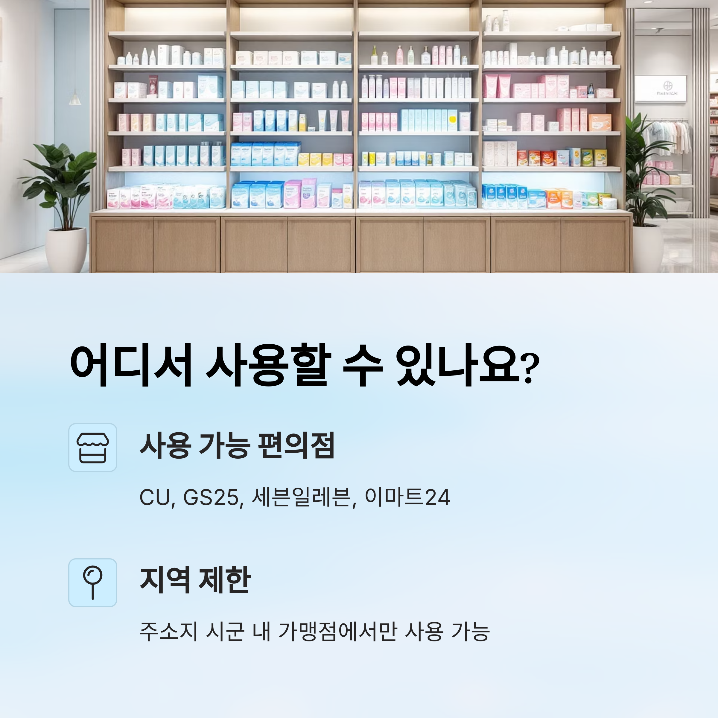 A4. 네, 주소지 시군 내 CU, GS25, 세븐일레븐, 이마트24 등 가맹점에서만 사용 가능해요.