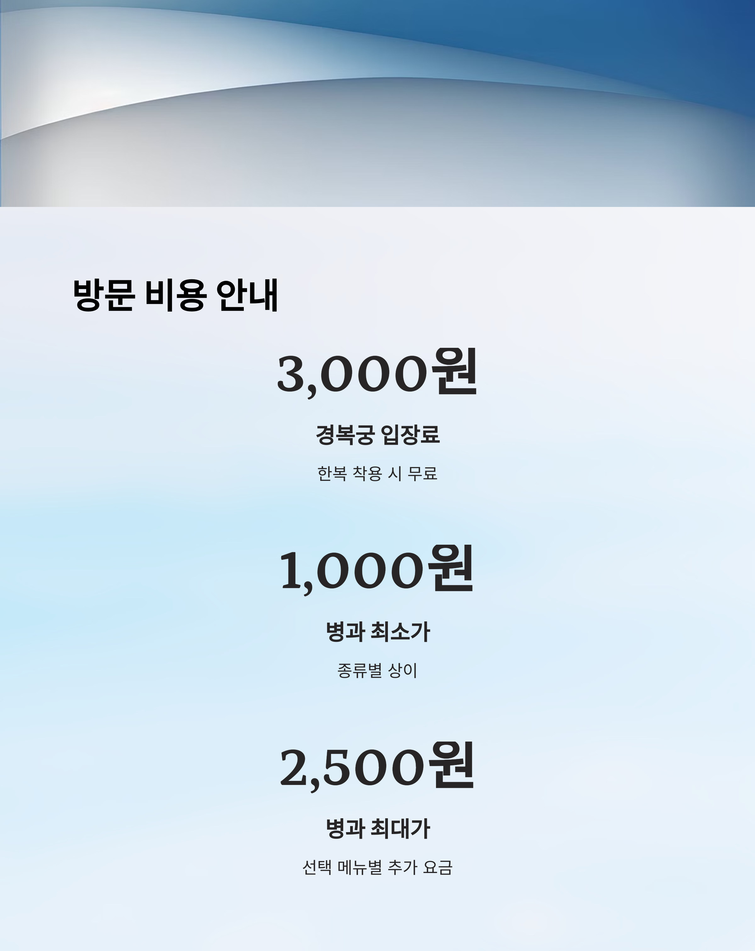 A2. 한복 착용 시 경복궁 입장료는 면제되지만 생과방 체험비는 별도로 결제해야 해요.