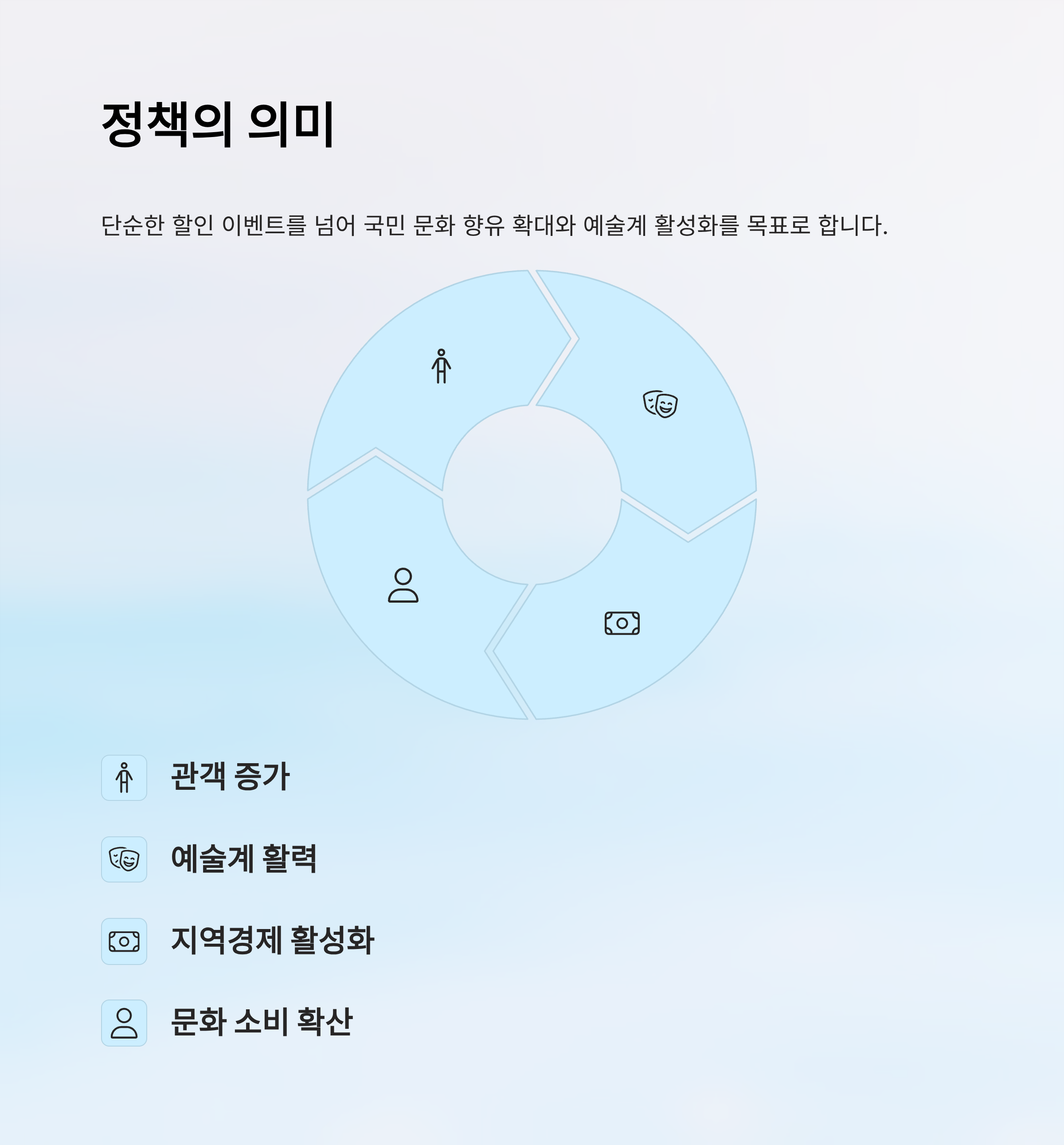 최근 몇 년 동안 문화예술계는 경기 침체와 관람객 감소로 어려움을 겪어왔어요. 코로나19 이후 회복세가 이어지고 있긴 하지만 여전히 문화 향유 격차가 존재하고, 특히 지역 간 불균형도 큰 상황이에요. 이런 맥락에서 정부는 국민들이 보다 쉽게 공연과 전시를 접할 수 있도록 접근성을 높이고, 동시에 예술계에 활력을 불어넣기 위해 할인권 정책을 시행하게 된 거예요.