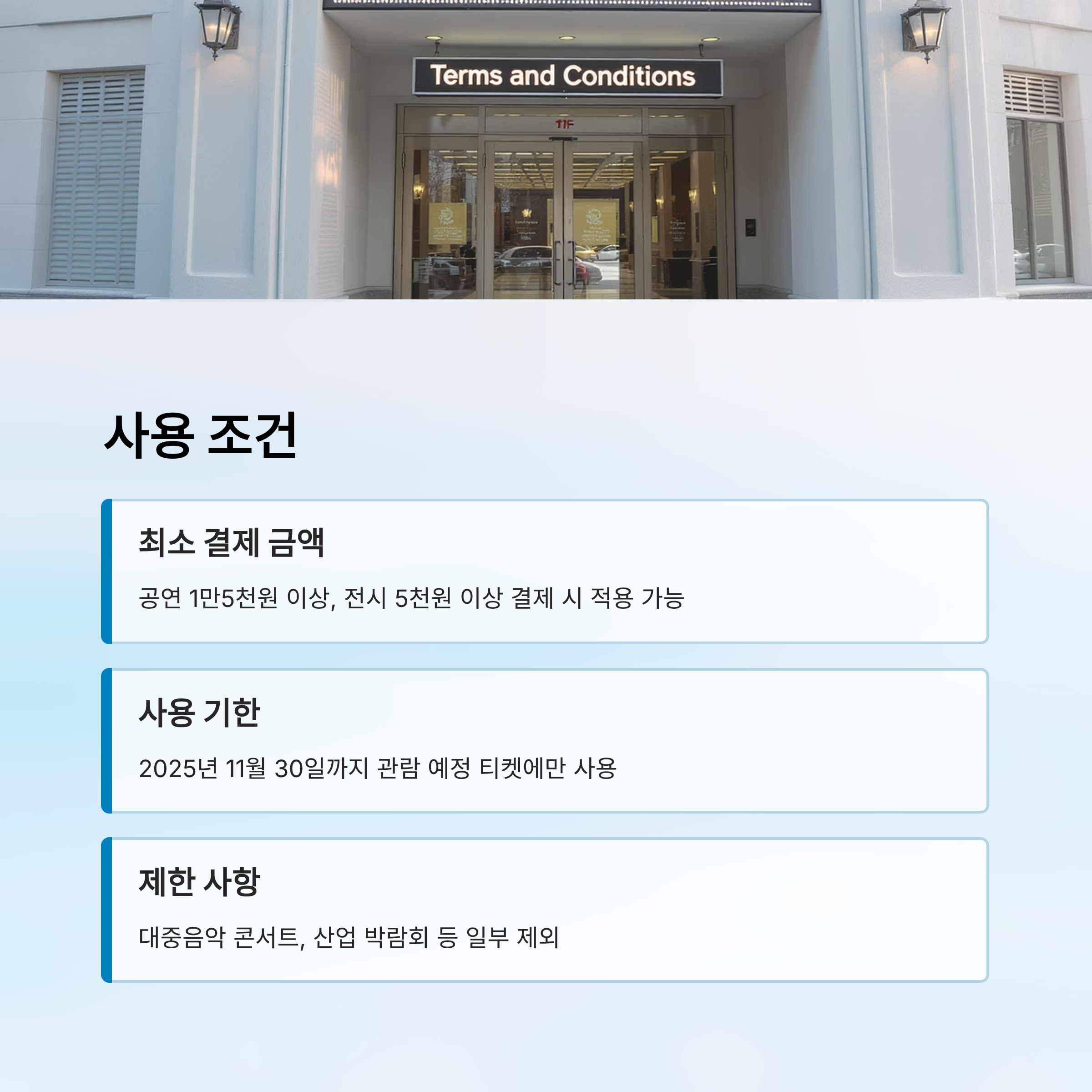 공연·전시 할인권은 발급만으로 끝나는 게 아니라, 실제 사용할 때 몇 가지 조건을 충족해야 해요. 공연 할인권은 최소 1만 5000원 이상, 전시 할인권은 5000원 이상 결제해야 적용돼요. 이런 조건 덕분에 혼자 한 장의 티켓을 사는 경우보다, 두 명 이상의 예매가 자연스럽게 늘어나면서 문화 참여율이 높아지는 효과가 있어요.