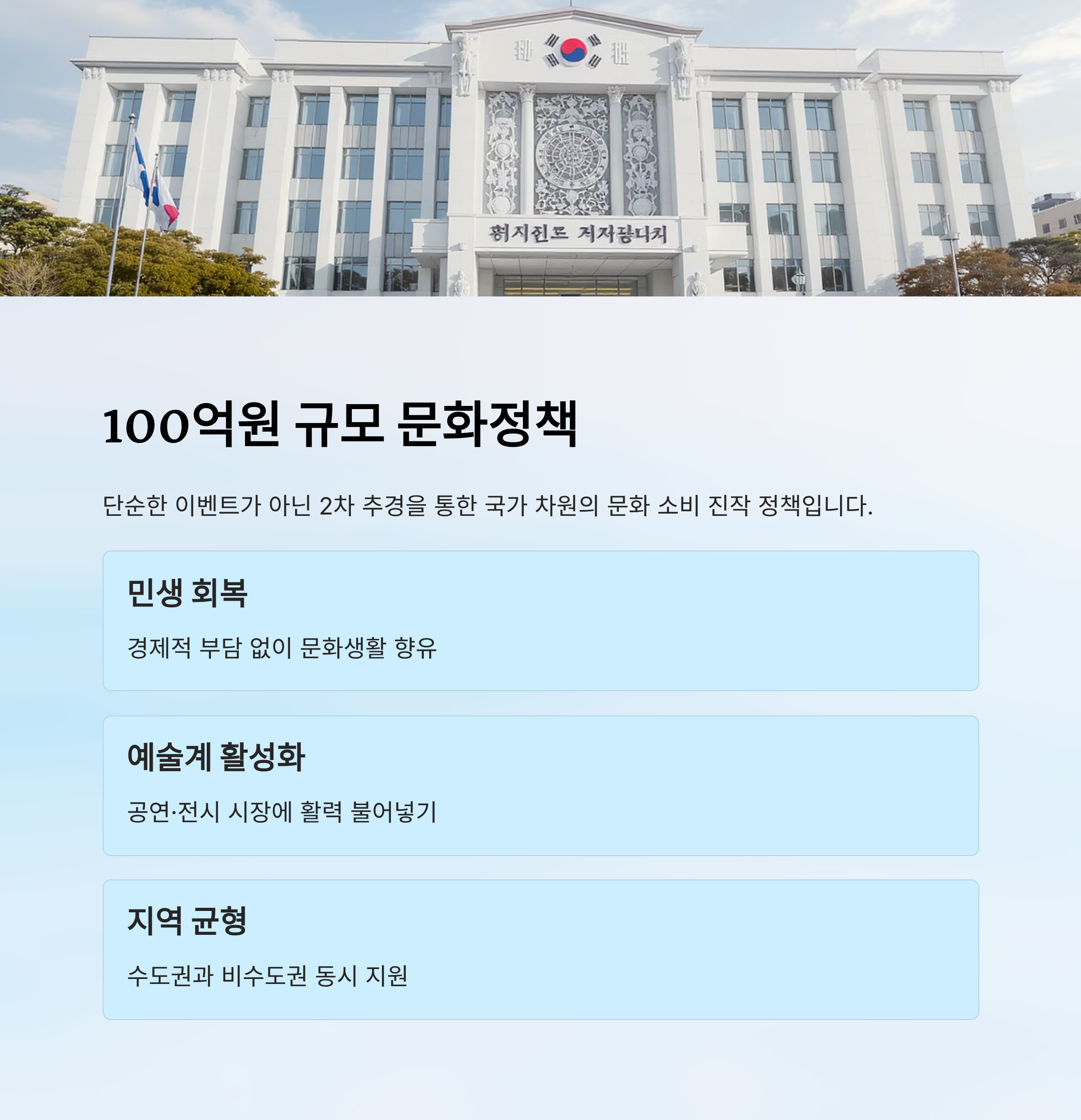 2025년 공연·전시 할인권은 단순한 이벤트가 아니라 정부 차원의 문화 소비 촉진 정책이에요. 문화체육관광부가 한국문화예술위원회와 예술경영지원센터 등과 협력해 추진하고 있으며, 총 100억 원 규모의 예산이 투입되었어요. 이번 사업은 2차 추가경정예산을 통해 마련된 재원을 활용해 추진된다는 점에서, 단순히 단기적인 프로모션이 아닌 국가 정책의 일환이라는 의미가 있어요.