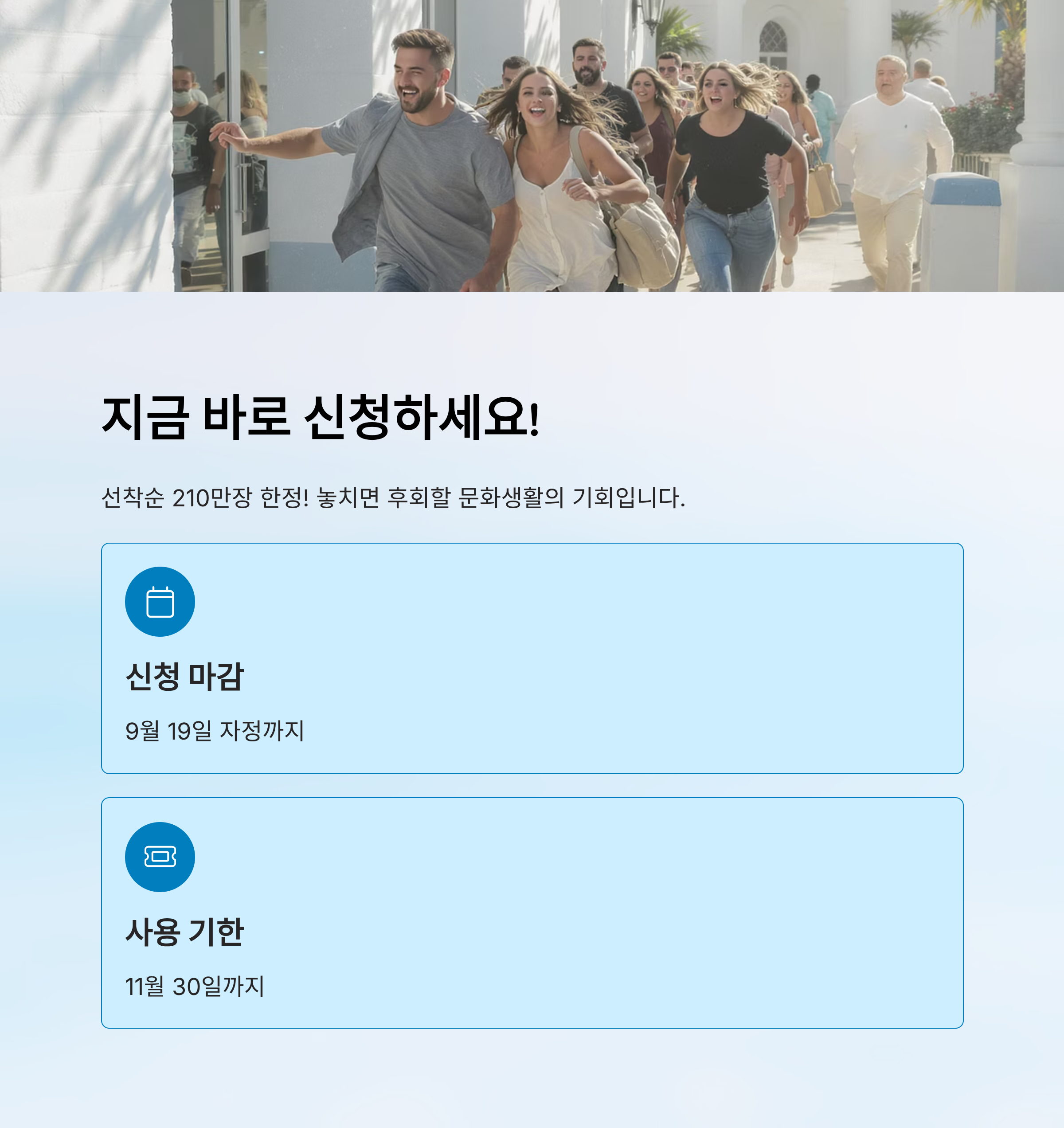 또한 공연과 전시 할인권은 각각 별도로 신청 가능하기 때문에 공연만 즐기고 싶은 사람, 전시만 보고 싶은 사람, 둘 다 경험하고 싶은 사람 모두 상황에 맞게 활용할 수 있어요. 특히 문화생활을 자주 하지 않았던 사람들에게는 이번 기회가 좋은 ‘문화 입문 패스’ 역할을 할 수 있답니다 🎨