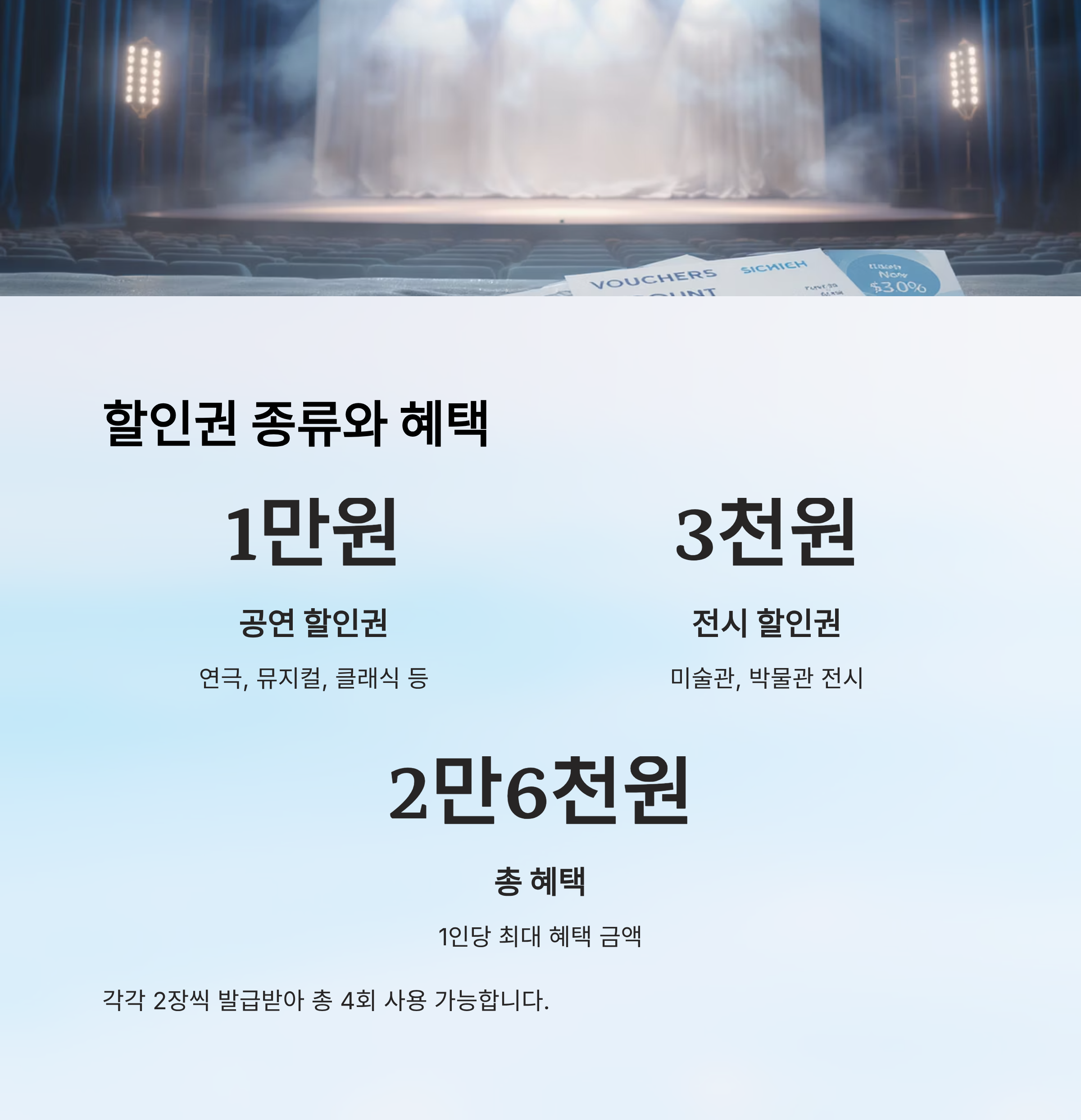 2025년 공연·전시 할인권은 크게 두 가지 종류로 나뉘어요. 공연 할인권은 장당 1만 원, 전시 할인권은 장당 3000원이에요. 각각 1인당 두 장씩 받을 수 있어서 공연 2만 원, 전시 6000원, 총 2만 6000원의 혜택을 누릴 수 있답니다. 단순히 한두 번 관람에 그치는 것이 아니라, 여러 차례 사용할 수 있다는 점에서 실질적인 지원 효과가 커요.