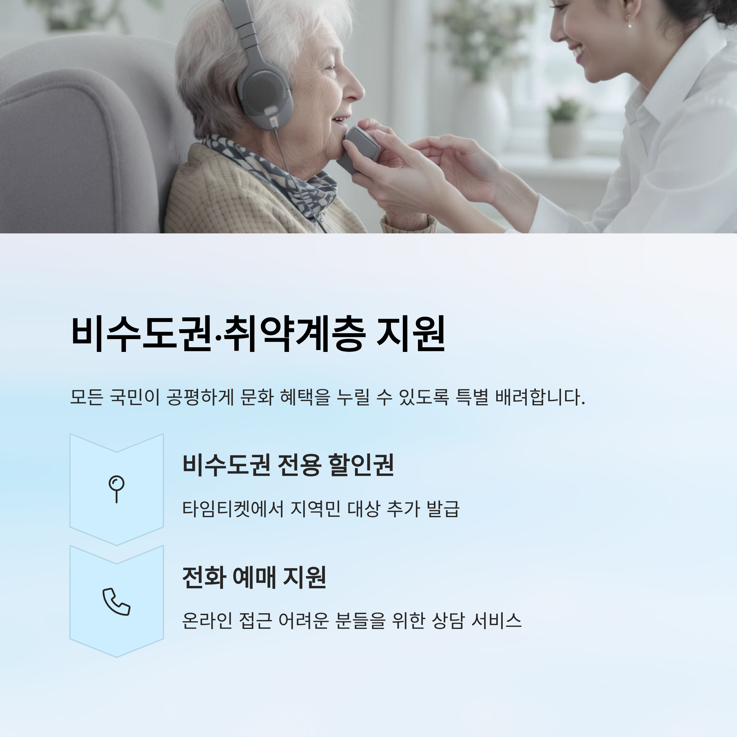 | 비수도권 주민 | 전용 할인권 1인 2장 추가 발급 | 대구, 광주, 제주 공연 관람 | 지역 문화 향유 기회 확대 |
