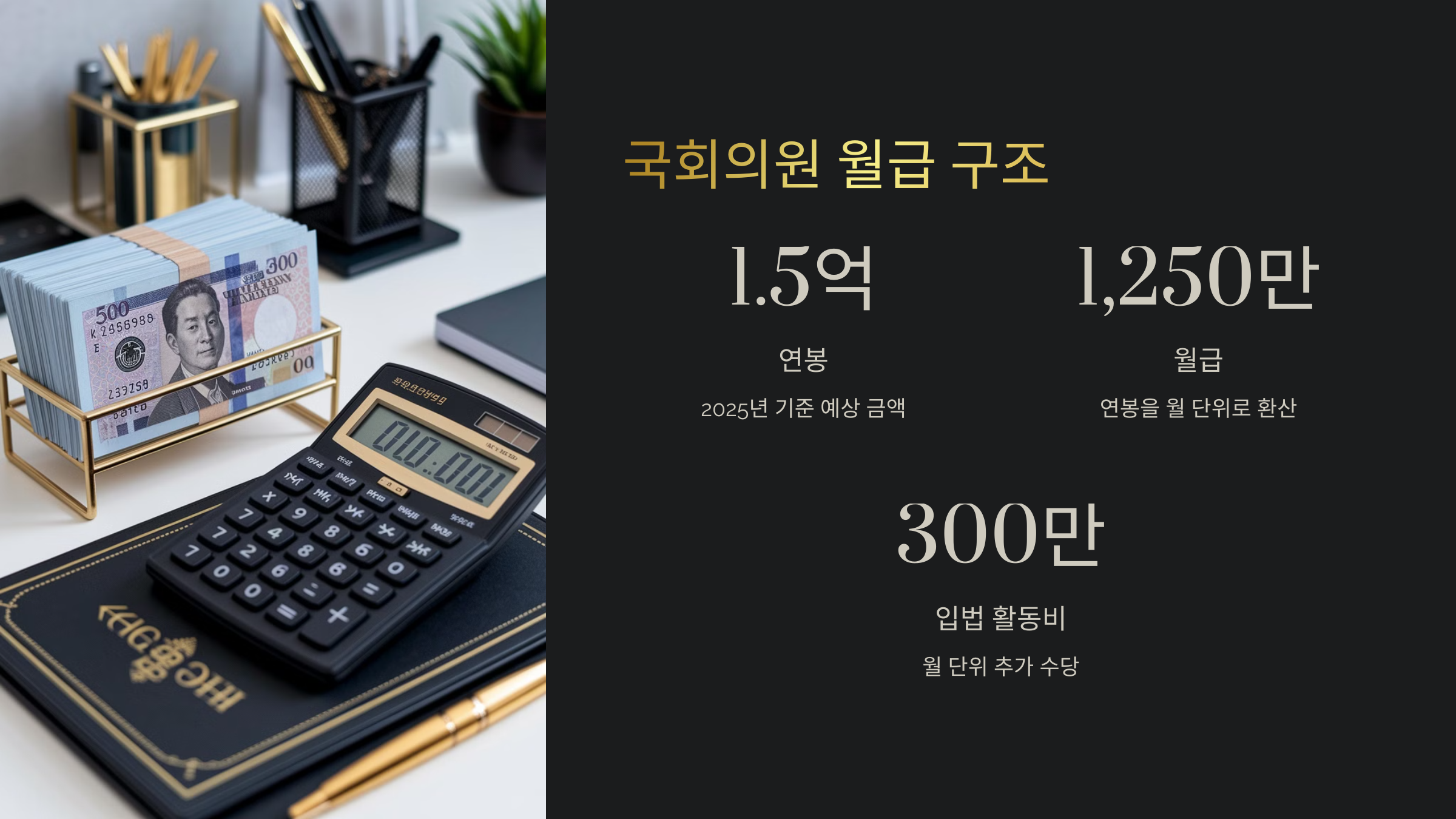 국회의원의 월급은 기본급에 각종 수당이 포함되어 있어요. 2025년 기준 국회의원의 연봉은 약 1억 5천만 원 수준으로 예상돼요. 월급으로 계산하면 약 1,250만 원 정도가 되는 셈이에요.