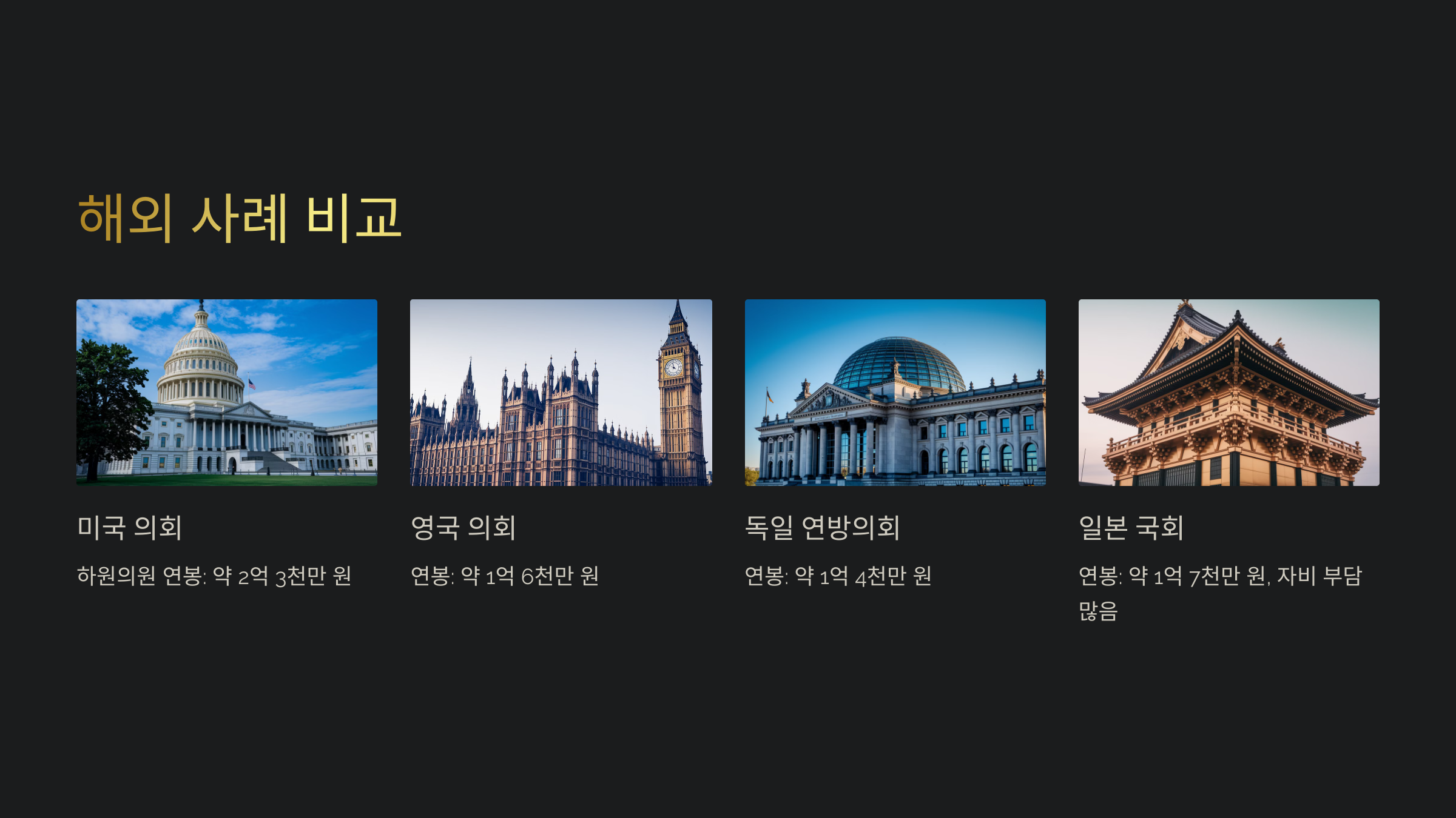 일본의 경우 국회의원 급여는 연간 약 1억 7천만 원 수준으로 한국보다 높아요. 하지만 일본은 의원들이 비용을 자비로 부담하는 경우가 많아 실질적인 혜택은 적어요.