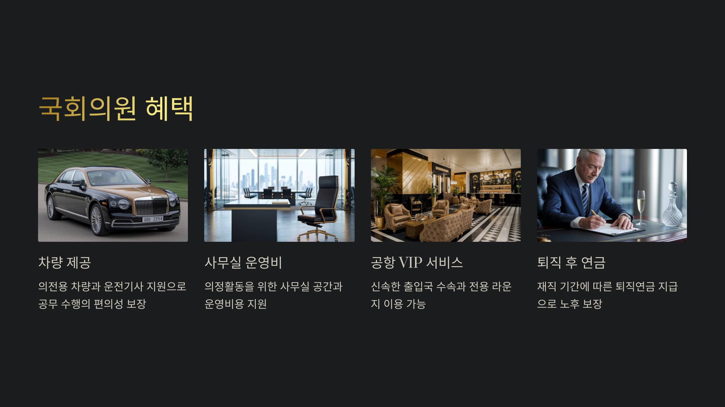 A4. 국회의원은 다양한 혜택을 받는데, 대표적으로 차량 제공, 공항 VIP 서비스, 보좌진 지원 등이 있어요. 또한, 퇴직 후에도 연금을 받을 수 있어 특혜 논란이 지속되고 있어요.