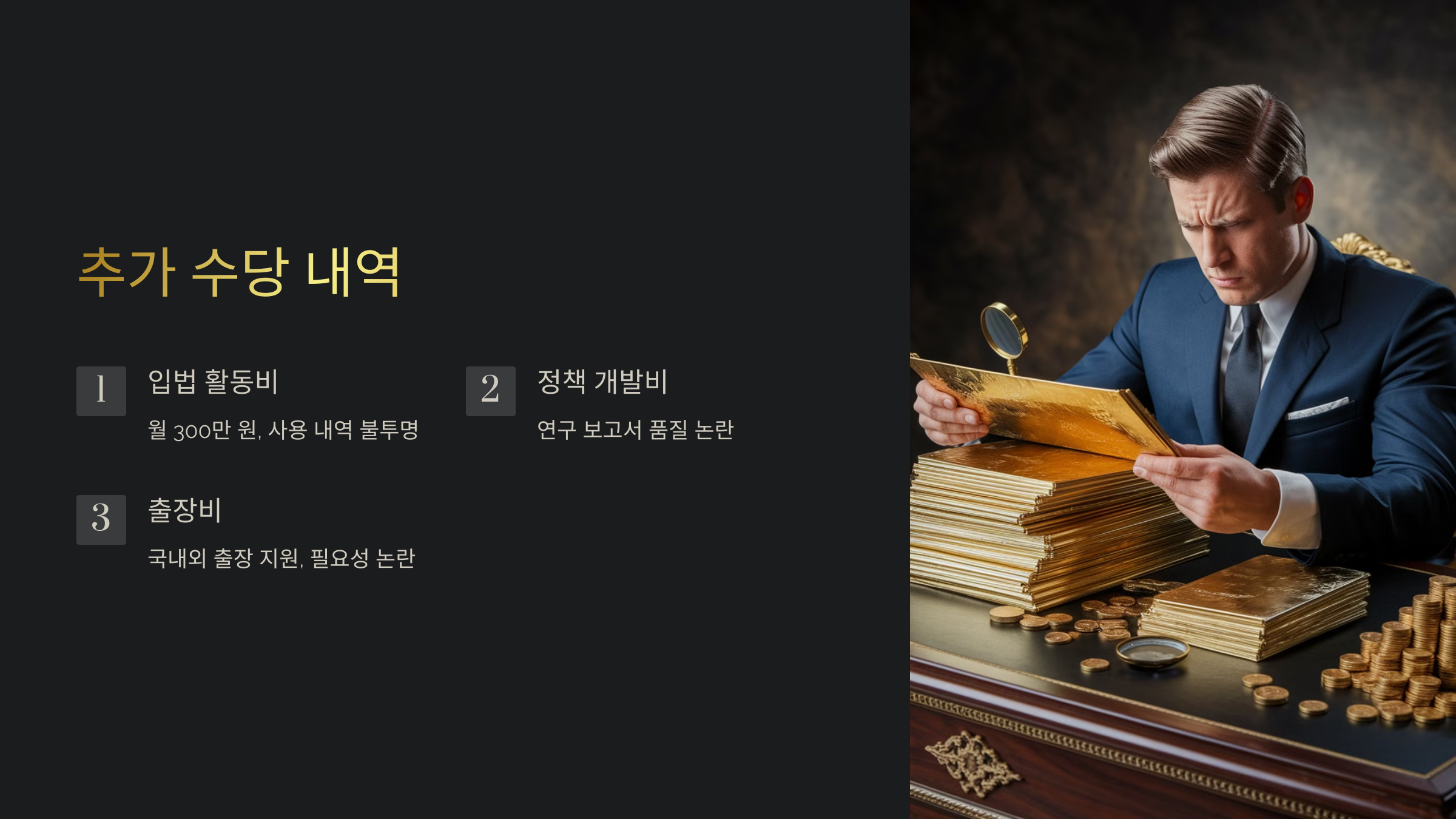 기본급 외에도 입법 활동비, 정책 개발비 등 다양한 명목으로 추가 수당이 지급돼요. 이로 인해 실질적인 수입은 공식 발표된 연봉보다 더 많아질 수 있어요.