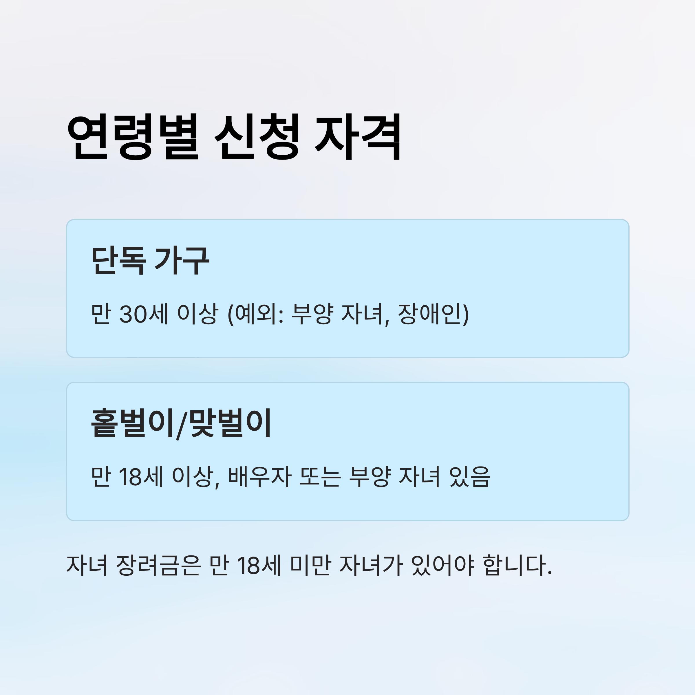 홑벌이 가구는 배우자 또는 부양 자녀가 있는 가구를 말해요. 이 경우 신청 연령 기준은 만 18세 이상이면 가능하며, 소득 요건만 충족하면 신청할 수 있어요. 예를 들어, 25세 근로자가 자녀를 양육하고 있다면 단독 가구 조건은 맞지 않지만, 홑벌이 가구 조건에 해당돼 신청할 수 있답니다.