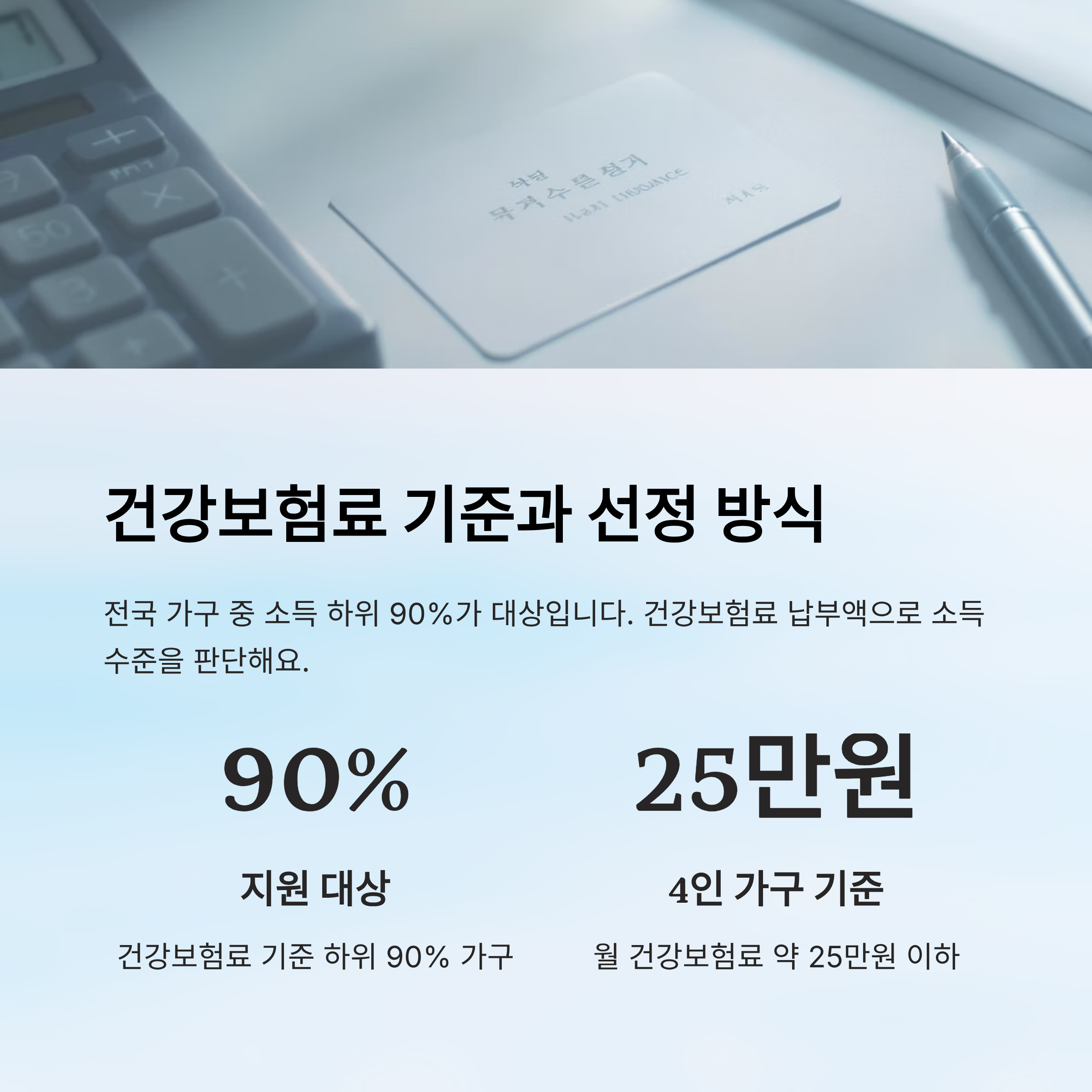 대상은 전국 가구 중 하위 90%에 해당하는 세대예요. 즉, 건강보험료 납부액이 상위 10%에 속하는 가구는 자동 제외돼요. 이 기준은 지역별·가구원 수별로 다르게 적용되며, 맞벌이 가구나 부양 가족 수가 많은 경우 보험료가 달라지기 때문에 단순 비교는 어렵답니다.