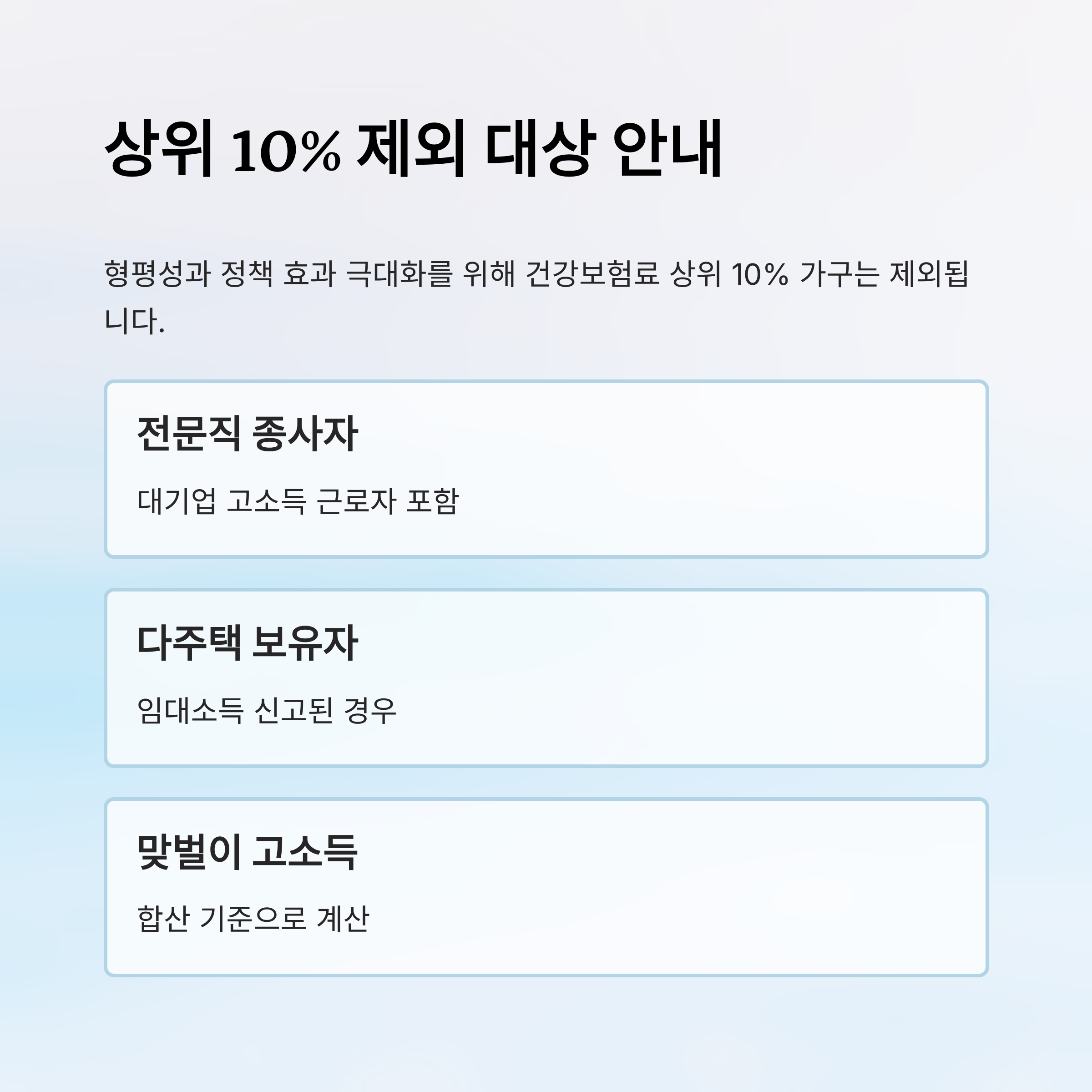 예를 들어 전문직 종사자, 대기업 고소득 근로자, 자영업 소득이 높은 일부 지역가입자 가구가 대표적인 제외 대상이에요. 특히 맞벌이 부부일 경우 합산 기준으로 계산되기 때문에 개별적으로 보면 중산층이라 느낄 수 있어도, 합산 금액으로 인해 상위 10%에 포함될 수 있답니다.