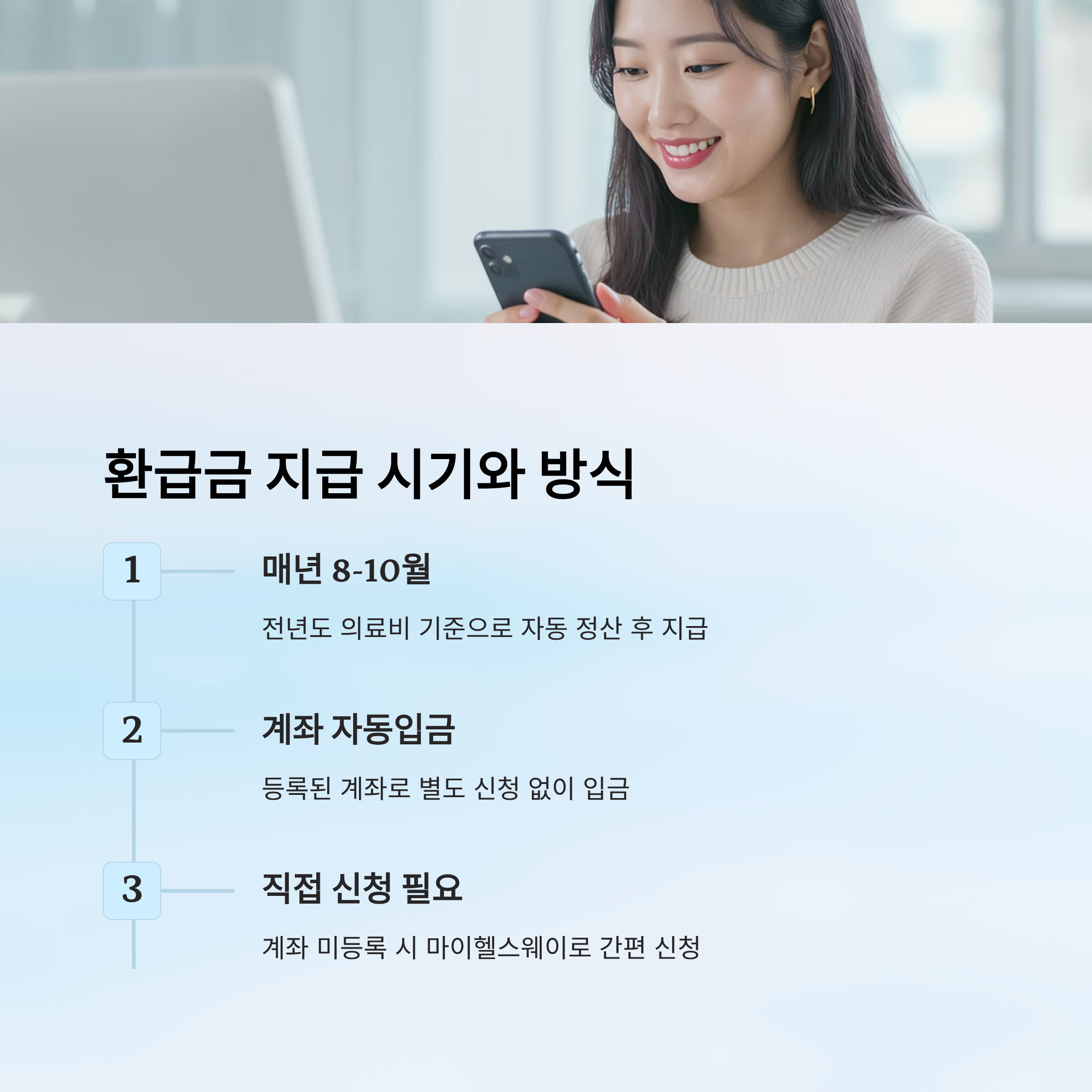 지급은 기본적으로 전년도 1월 1일부터 12월 31일까지 발생한 의료비를 기준으로 산정한 뒤, 다음 해 8월부터 순차적으로 이뤄져요. 예를 들어, 2024년 병원비에 대한 환급은 2025년 8~10월에 지급되는 식이에요.