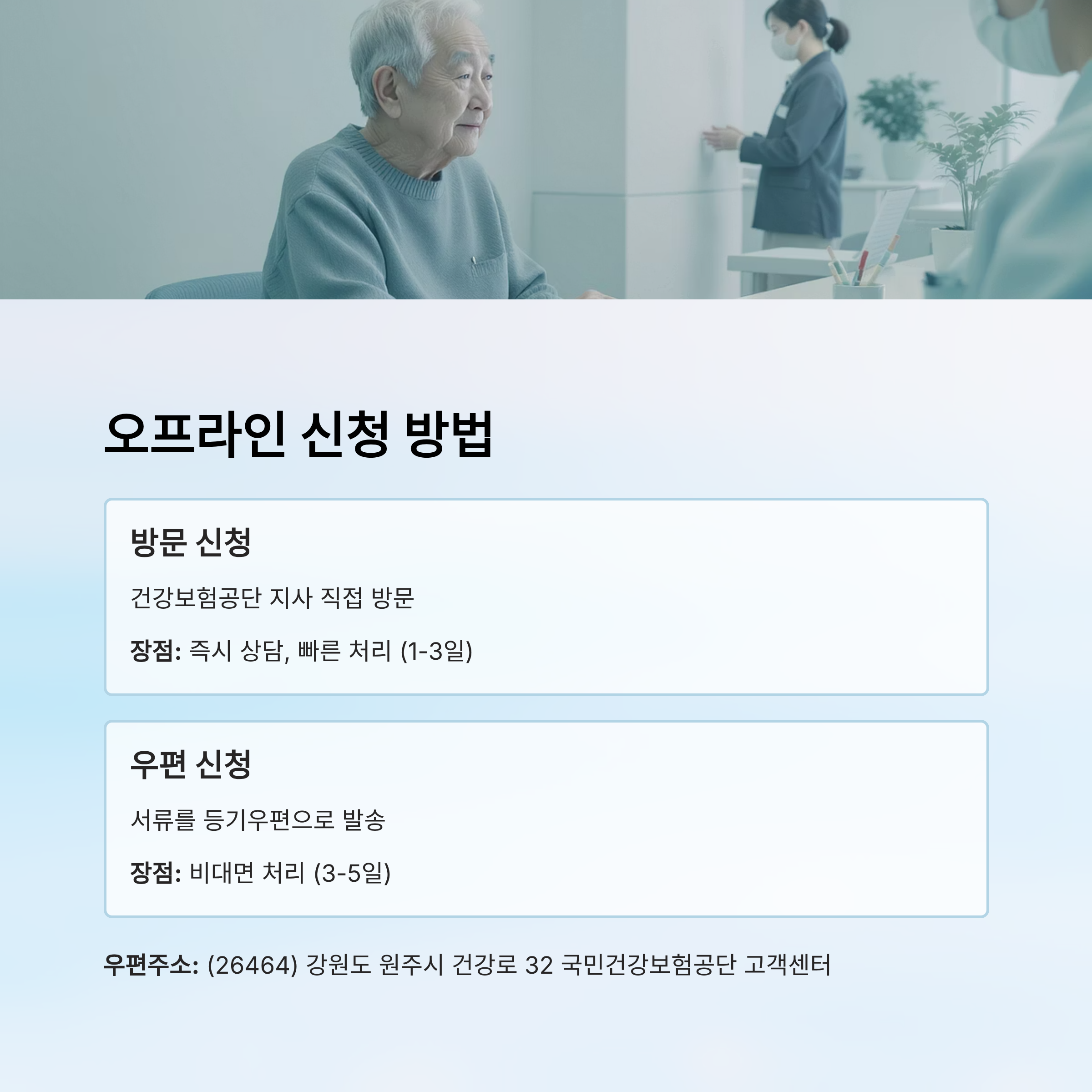 오프라인 신청은 크게 두 가지 방법이 있어요. 첫째는 가까운 국민건강보험공단 지사를 직접 방문하는 것이고, 둘째는 신청서류를 우편으로 보내는 방법이에요. 아래 표에서 각각의 방법을 비교해볼게요!