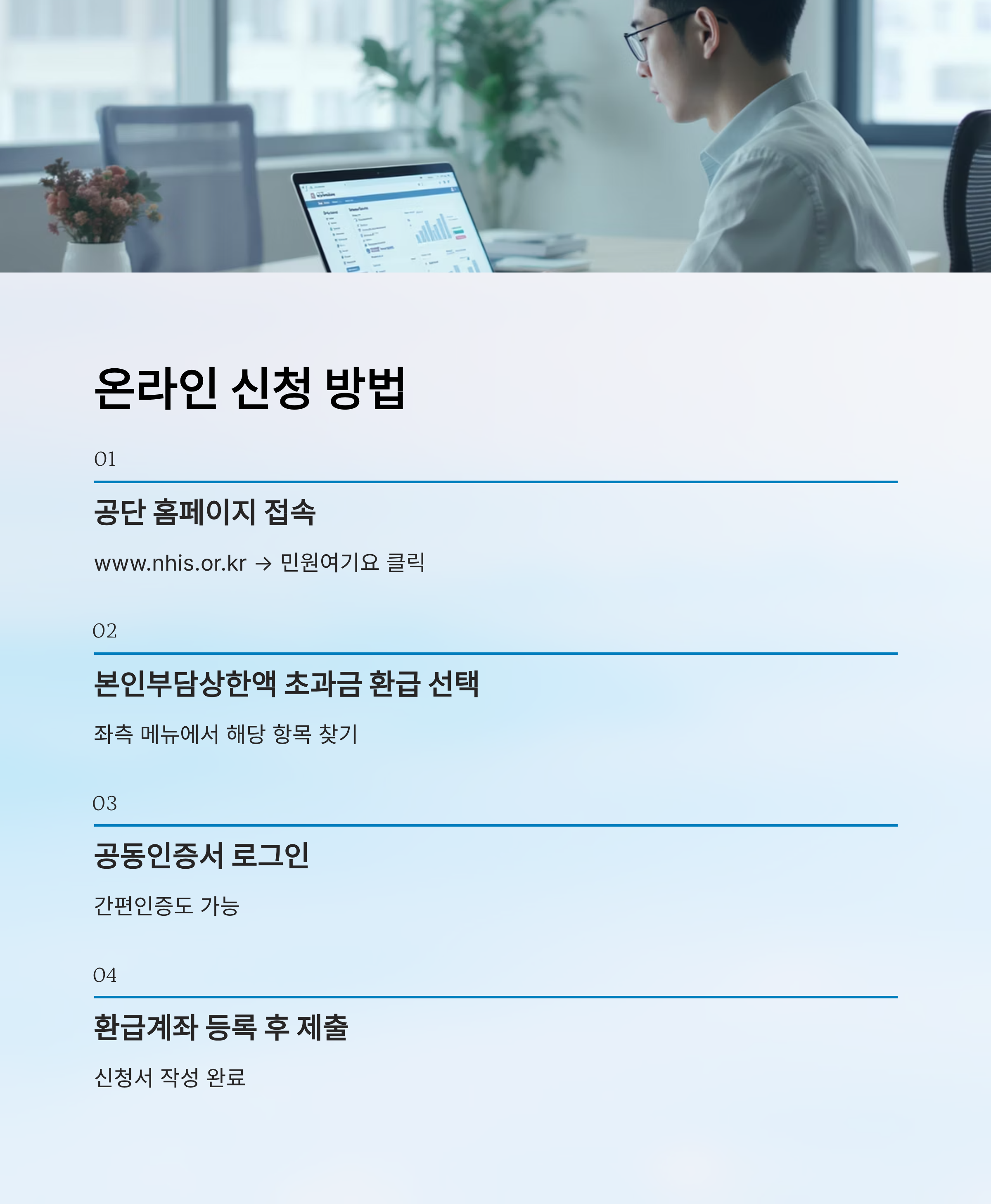 온라인으로 본인부담상한제 환급을 신청하려면 국민건강보험공단 공식 웹사이트 또는 ‘The건강보험’ 모바일 앱을 이용하면 돼요. 요즘은 모바일로도 간편하게 신청할 수 있어서 정말 편해졌어요. 🙌