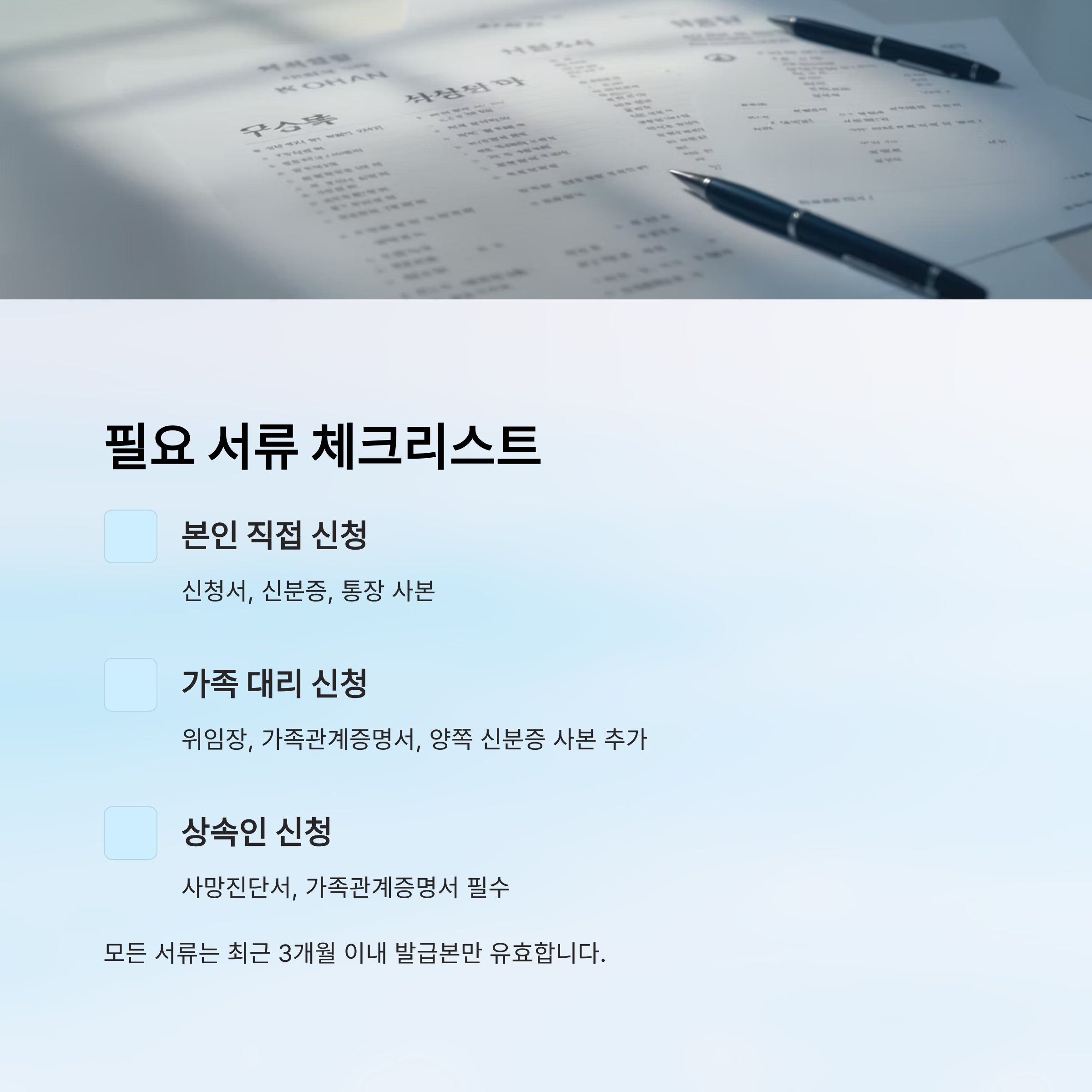 | 대리 신청 (가족) | 신청서, 위임장, 가족관계증명서, 신분증 사본(양쪽), 통장 사본 | 부모·자녀 간 신청 가능 |