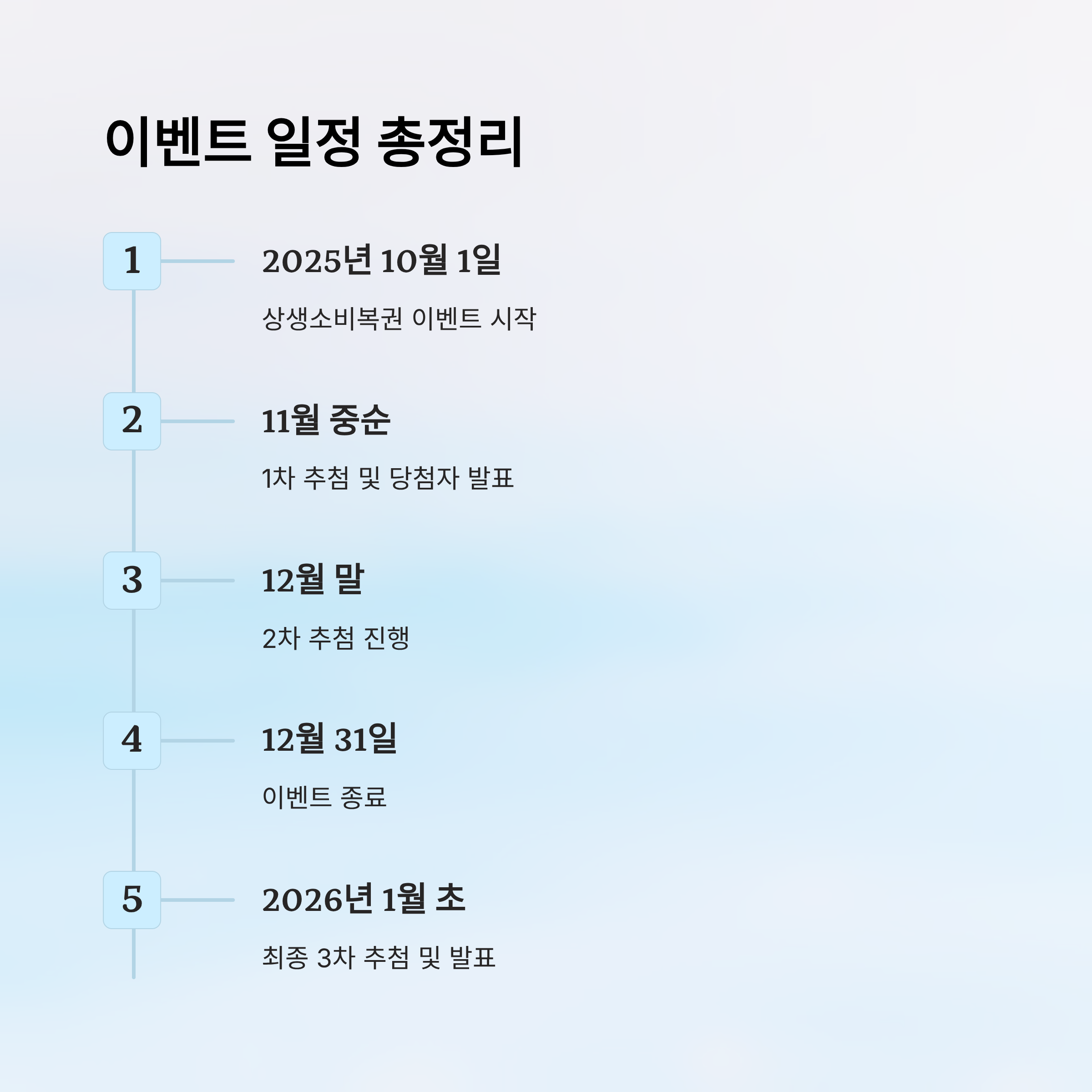 2025년 상생소비복권 이벤트는 10월 1일부터 12월 31일까지 총 3개월간 진행돼요. 이 기간 동안 누적 소비 내역이 응모 기준이 되며, 중간 발표와 최종 발표가 각각 다르게 진행되기 때문에 꼭 체크해야 해요.