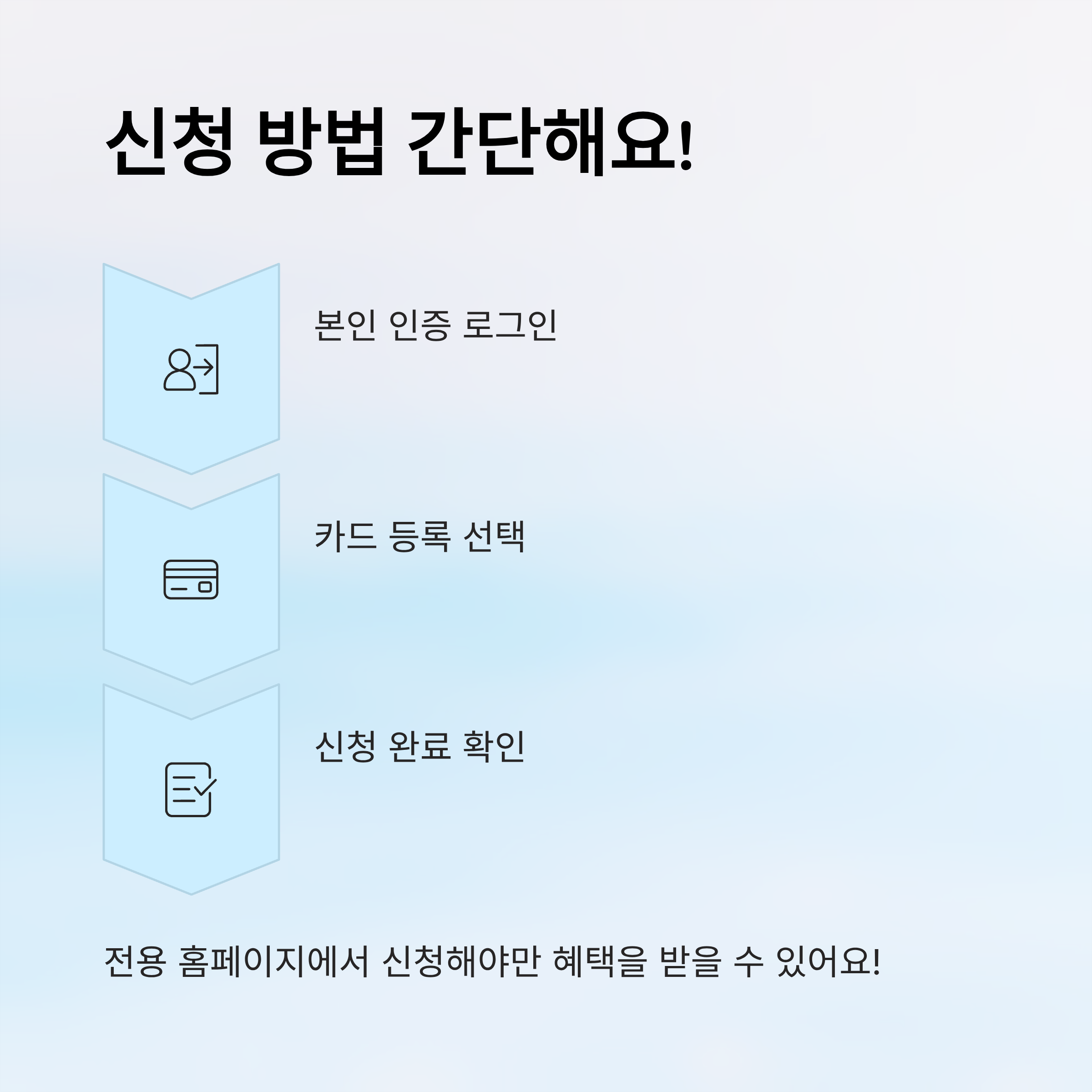 두 번째는 카드 등록 단계예요. 본인이 혜택을 받고 싶은 카드(신용카드 또는 체크카드)를 선택하고 등록해야 해요. 일부 카드는 제도 참여에서 제외될 수 있기 때문에 반드시 신청 페이지에서 제공하는 ‘참여 가능 카드 리스트’를 확인하는 것이 좋아요. 보통 주요 시중은행 카드사 대부분은 참여하지만, 체크카드나 법인카드, 선불카드는 제외될 수 있답니다.