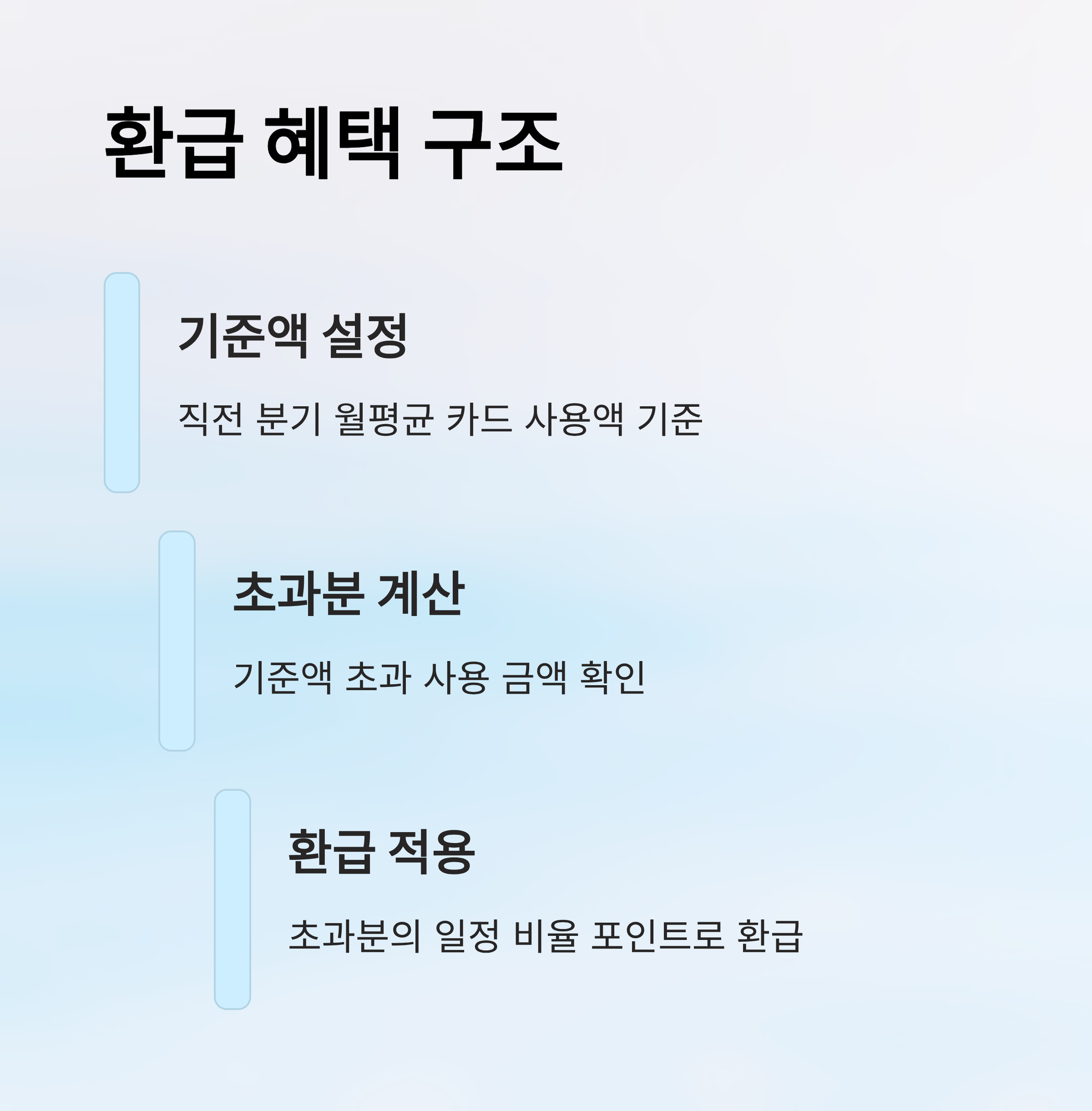 구체적으로 설명하면, 2025년 2분기(4~6월)나 3분기(7~9월) 같은 직전 분기 평균 카드 사용액을 기준으로 삼아요. 9월부터 11월까지의 카드 사용액이 기준치를 초과하면, 그 초과분의 일정 비율을 환급해 주는 구조예요. 예를 들어 직전 분기 월평균 카드 사용액이 100만 원이었는데, 10월에 130만 원을 사용했다면 30만 원이 초과분이 되고, 이 금액의 일정 비율(예: 10%)을 페이백으로 받을 수 있는 방식이에요.