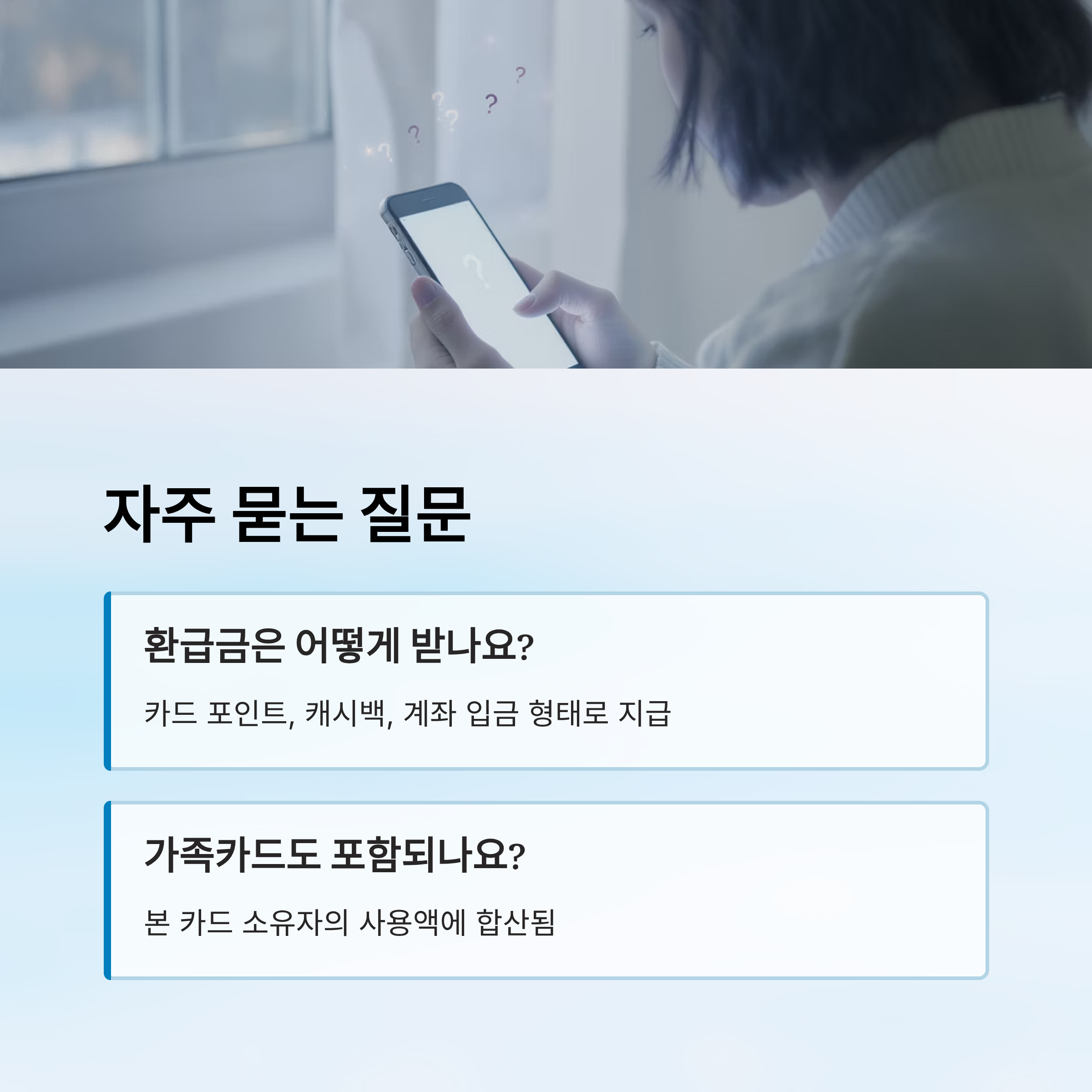 A5. 환급금은 카드사 포인트, 캐시백, 또는 계좌 입금 형태로 지급돼요. 구체적인 지급 방식은 카드사별로 차이가 있을 수 있어요.
