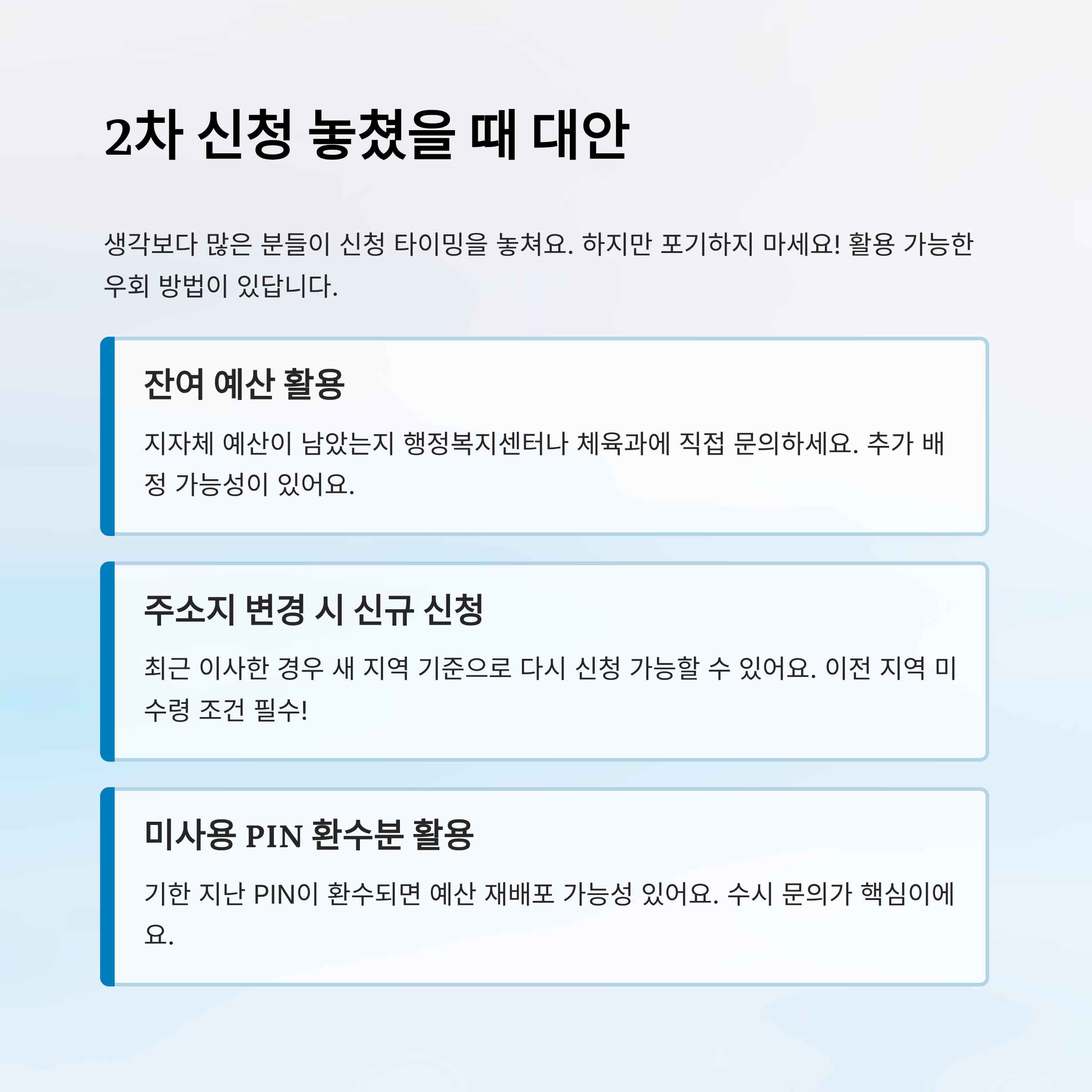 첫 번째는 ‘잔여 예산 소진 전 개별 문의’ 전략이에요. 예산이 아직 남아 있을 경우, 지역 행정복지센터나 체육과에 직접 문의하면 접수 가능한 경우가 있어요. 이미 2차가 끝났더라도 시스템상 남아 있는 예산이 있으면 추가 배정되는 사례도 있어요.