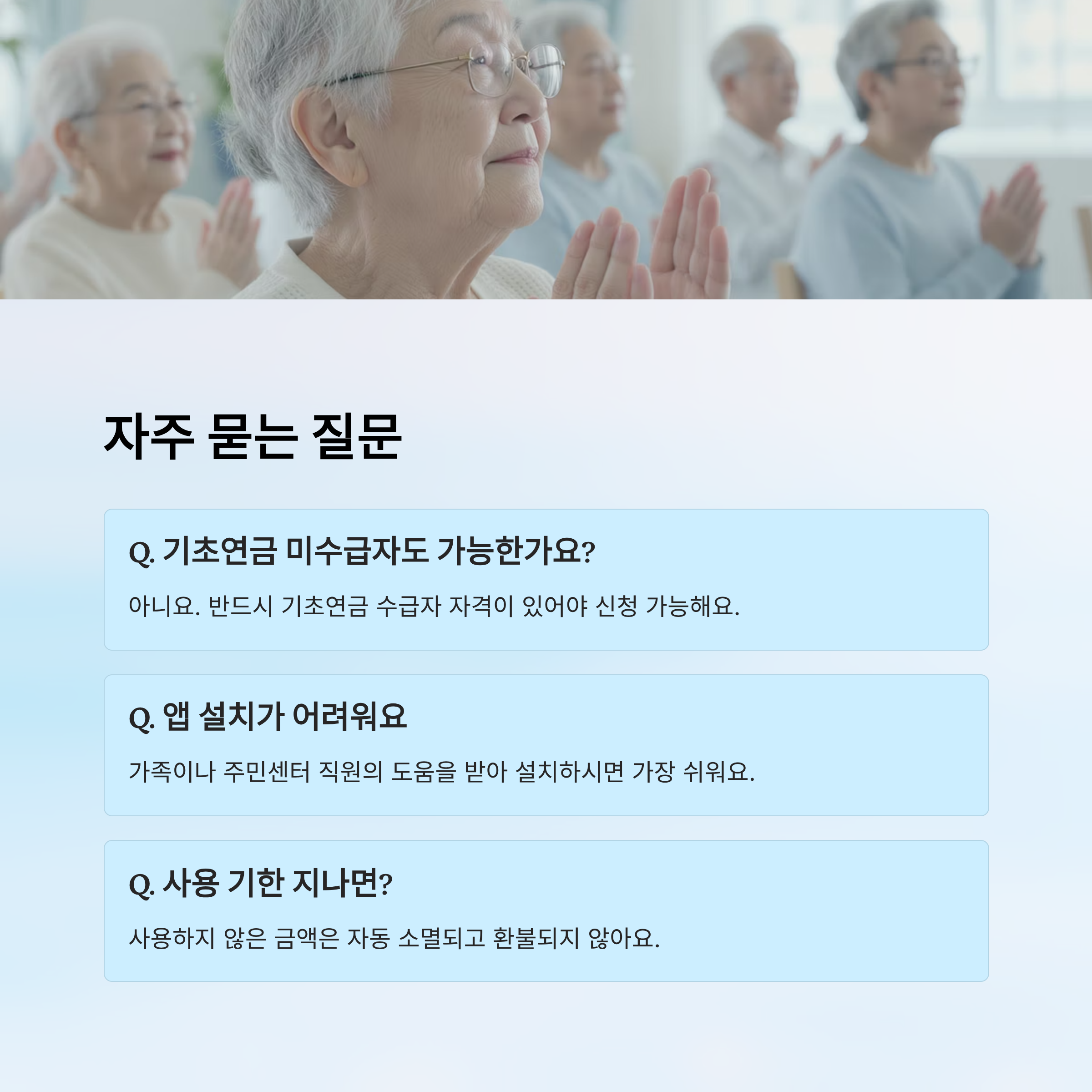 A2. 아니요, 반드시 기초연금 수급자 자격이 있어야 신청 가능해요.