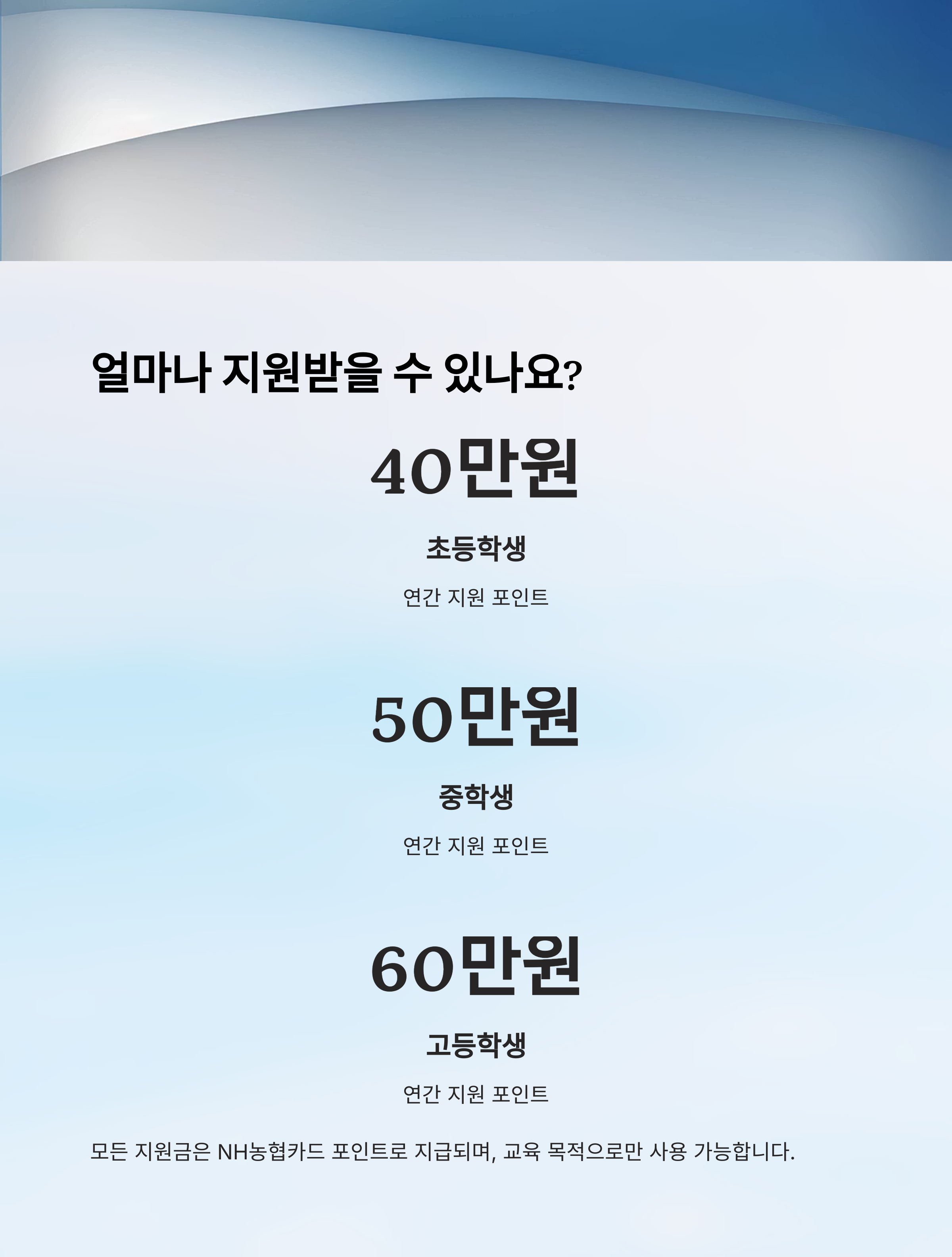 | 초등학생 | 40만 원 | NH농협카드 포인트 | 교재, 독서실, 교육플랫폼 |