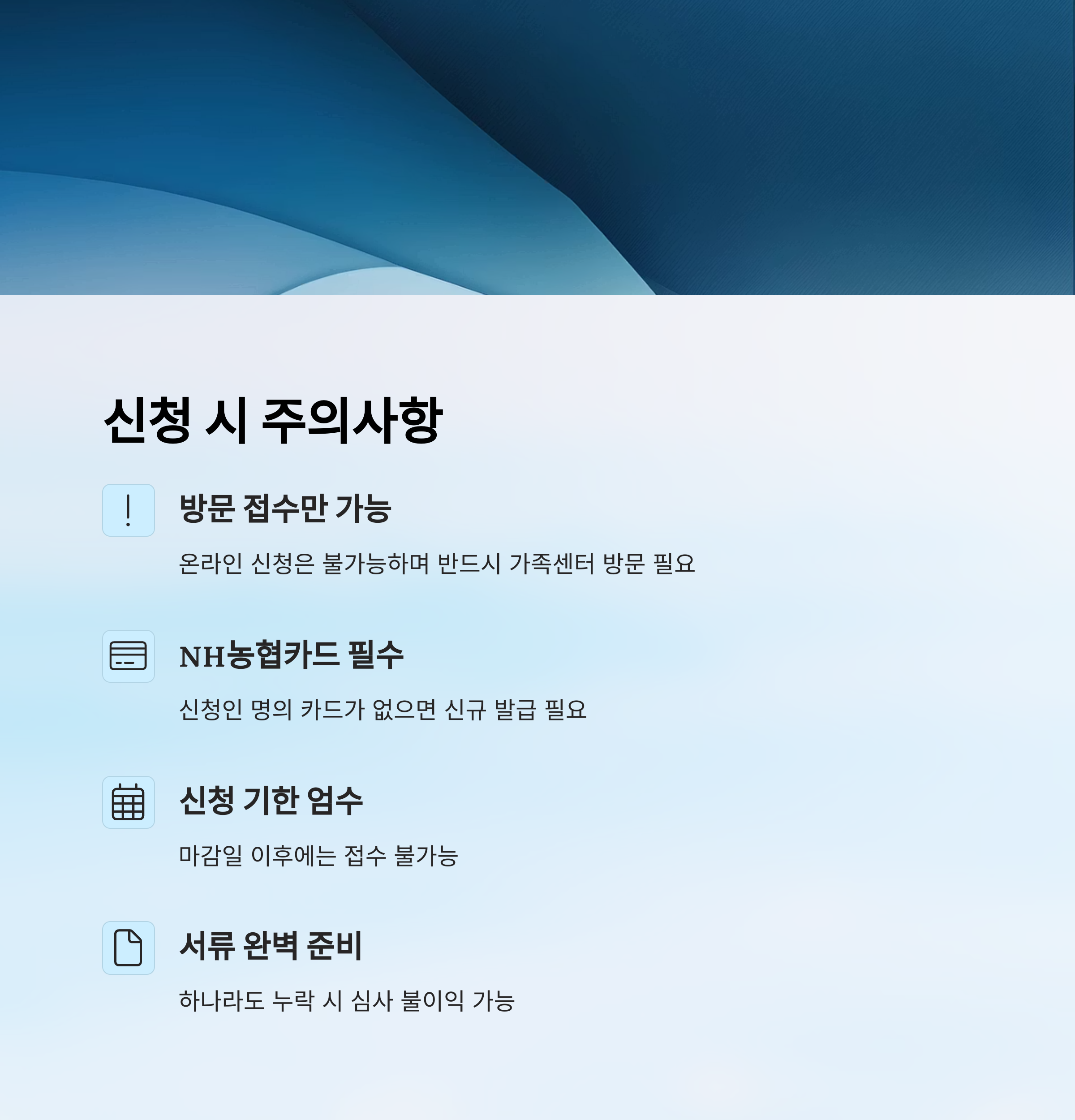 | 카드 발급 | 신청인 명의 농협카드 필요 | ✅ |