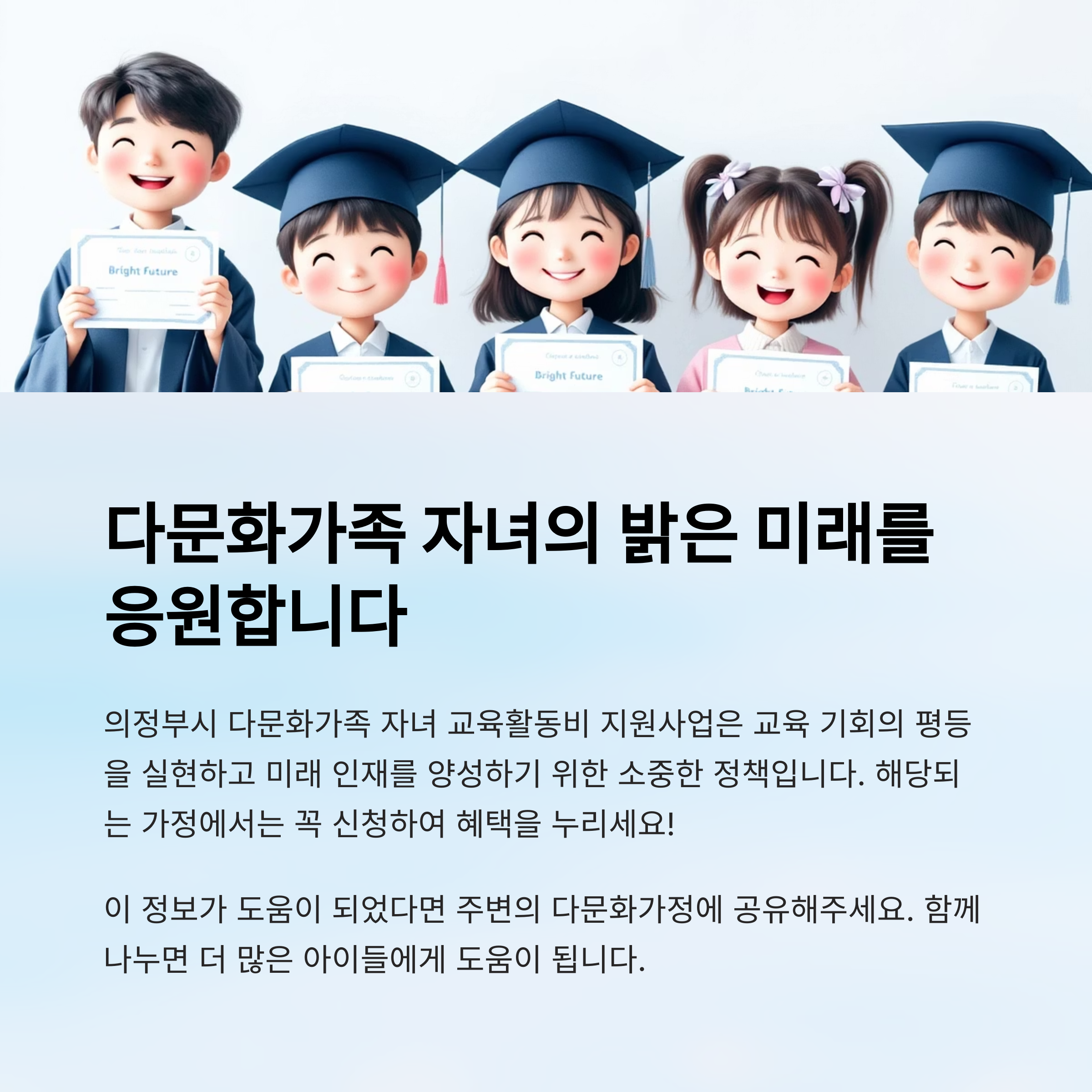 지금부터 의정부시에 거주하는 다문화가정이라면 꼭 알아야 할 '다문화가족 자녀 교육활동비 지원사업'의 신청 방법부터 구비서류, 유의사항까지 차근차근 알려드릴게요. 특히 신청 마감일이 있으니 끝까지 꼼꼼하게 확인해 주세요!