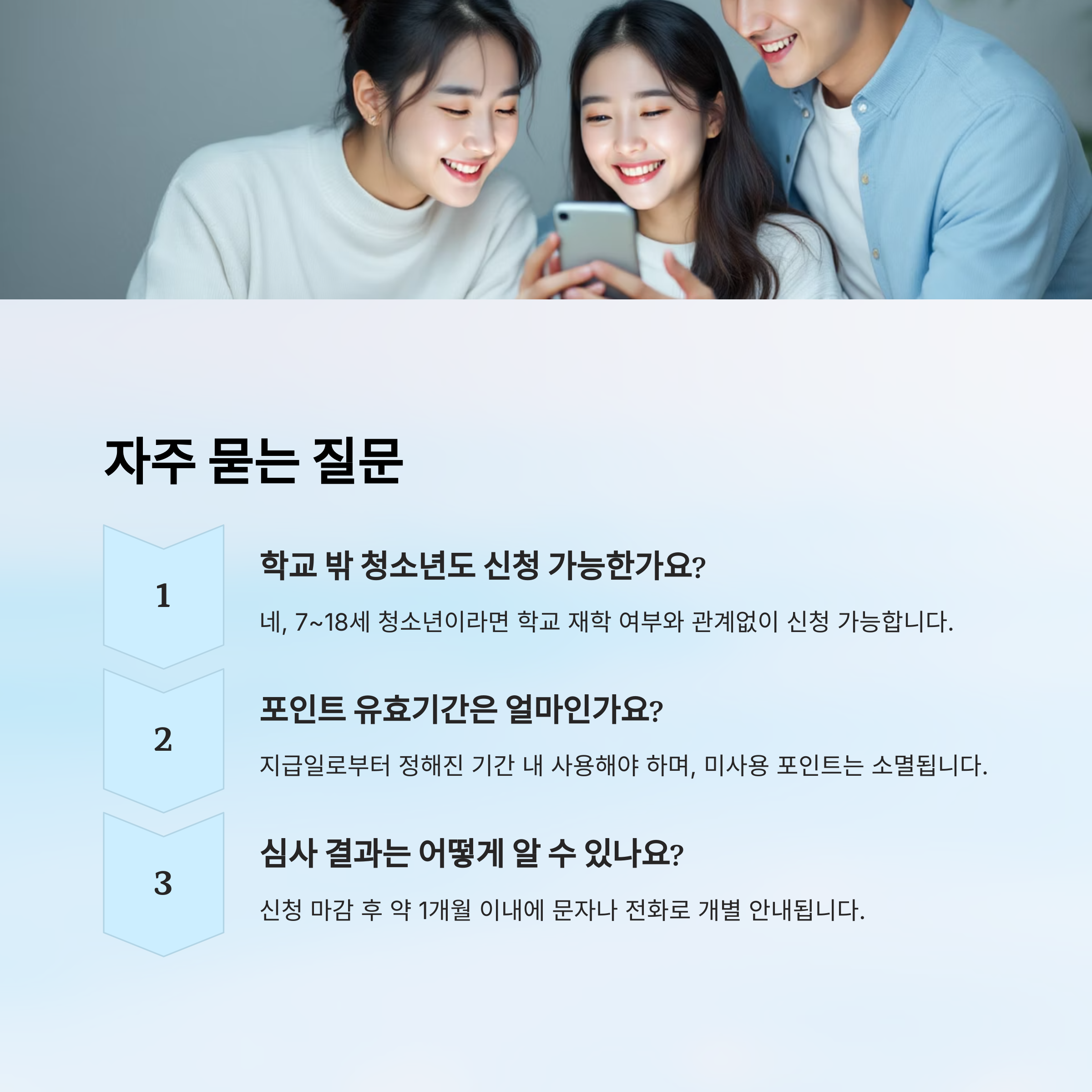 A3. 네, 가능합니다! 재학생은 물론, 학교 밖 청소년도 만 7세~18세라면 신청할 수 있어요.