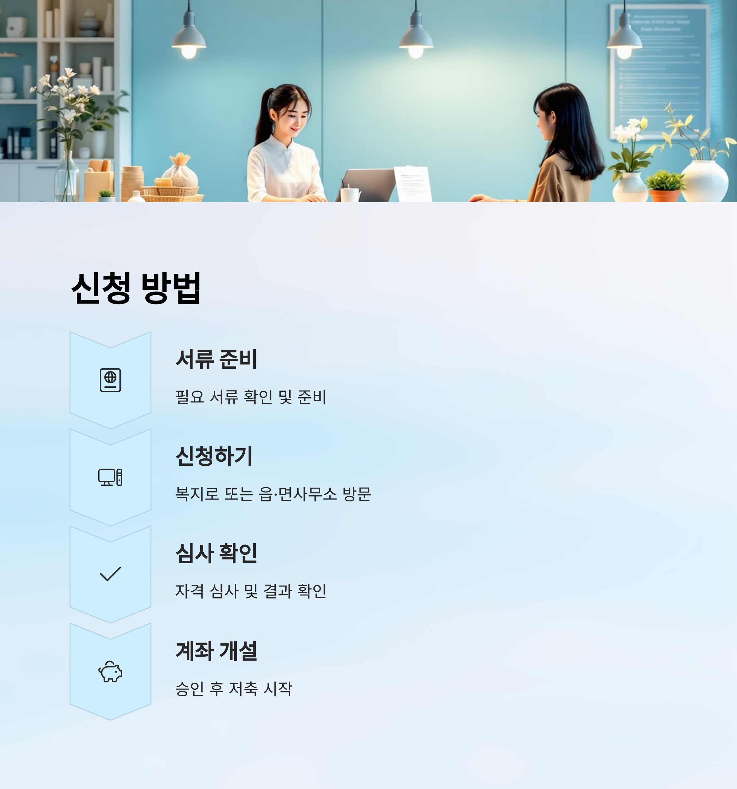 방문 신청을 선호하는 분들은 주소지 관할 읍·면사무소를 직접 방문하면 돼요. 제출 서류를 모두 지참한 뒤 복지상담팀에 접수하면 되니, 주민센터 업무 시간(보통 09:00~18:00)을 고려해 방문하세요. 🕘