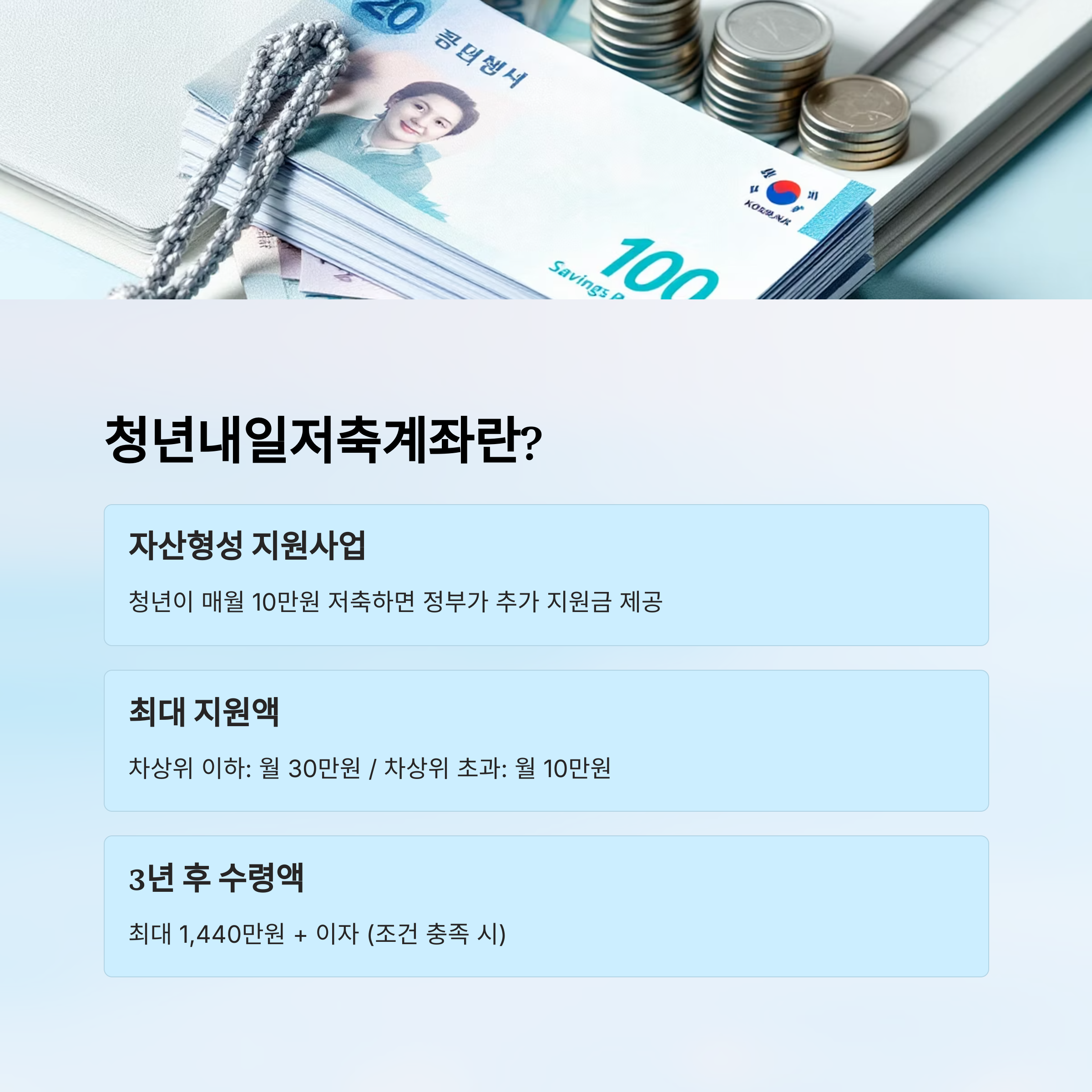 청년내일저축계좌는 근로 중인 청년이 매월 10만 원씩 저축하면, 정부가 일정 금액을 추가로 지원해주는 자산 형성 지원 사업이에요. 이 계좌를 통해 청년들이 스스로의 힘으로 미래를 준비할 수 있도록 도와주는 목적을 가지고 있답니다.