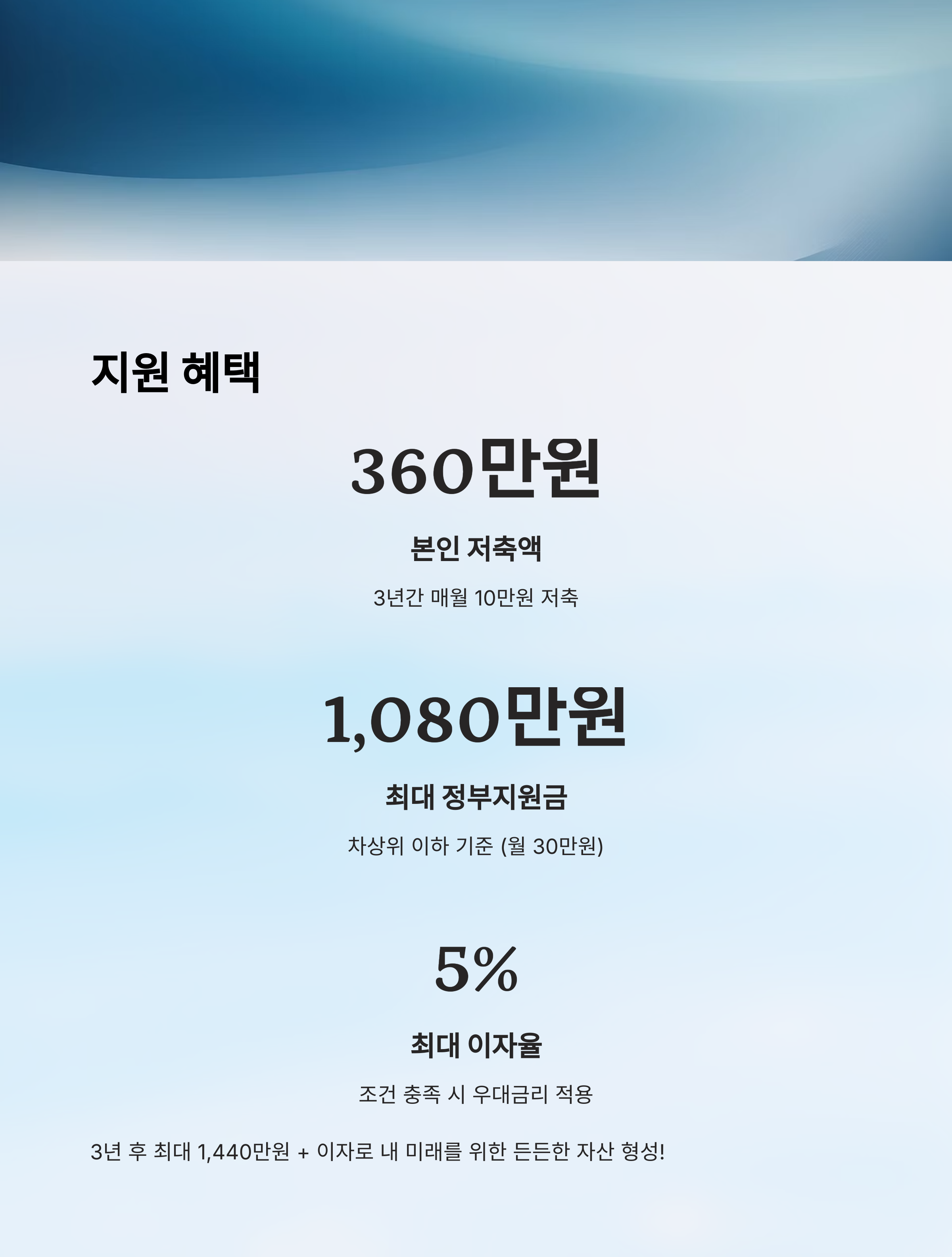 청년은 매달 10만 원씩 저축하고, 정부는 차상위 이하 청년에게는 30만 원, 초과 청년에게는 10만 원을 더해줘요. 이렇게 3년간 저축하면 총 720만 원에서 1,440만 원까지 모을 수 있게 돼요. 여기에 이자까지 더해지면 더 큰 목돈이 생기겠죠? 💰