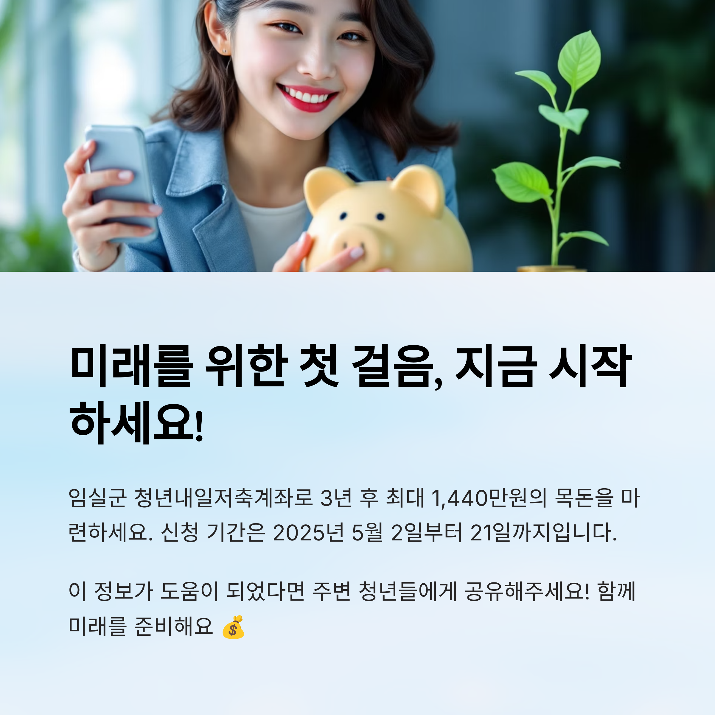 임실군에서 2025년 청년내일저축계좌 신규가입자를 모집하고 있어요! 근로 청년이라면 3년 뒤 최대 1,440만 원을 모을 수 있는 절호의 기회랍니다. 😊