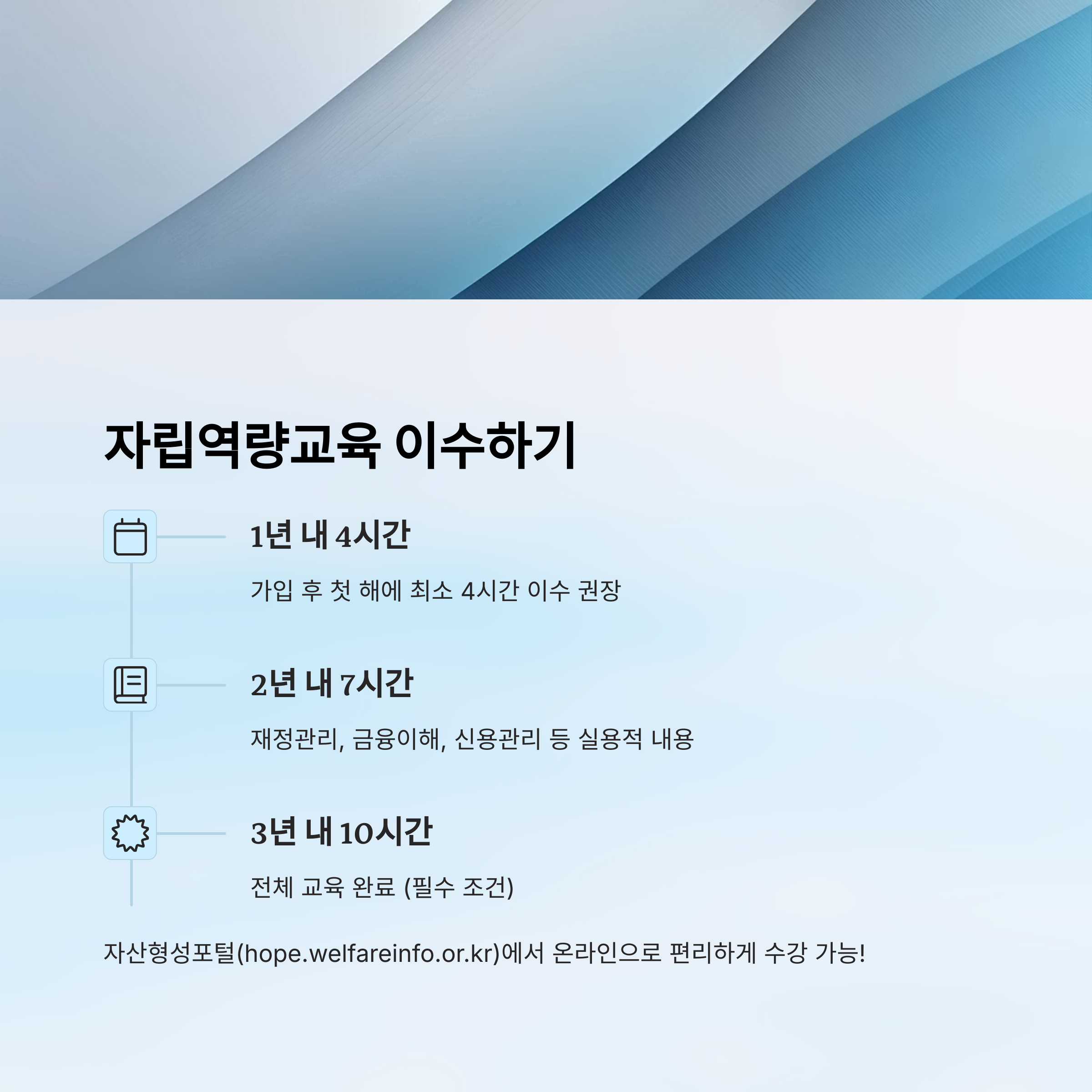 청년내일저축계좌를 통해 정부지원금을 받으려면 꼭 이수해야 하는 게 있어요! 바로 ‘자립역량교육’이에요. 이 교육은 재무관리 능력을 키워서 청년들이 경제적으로 자립할 수 있도록 도와주는 아주 실용적인 프로그램이에요. 💡