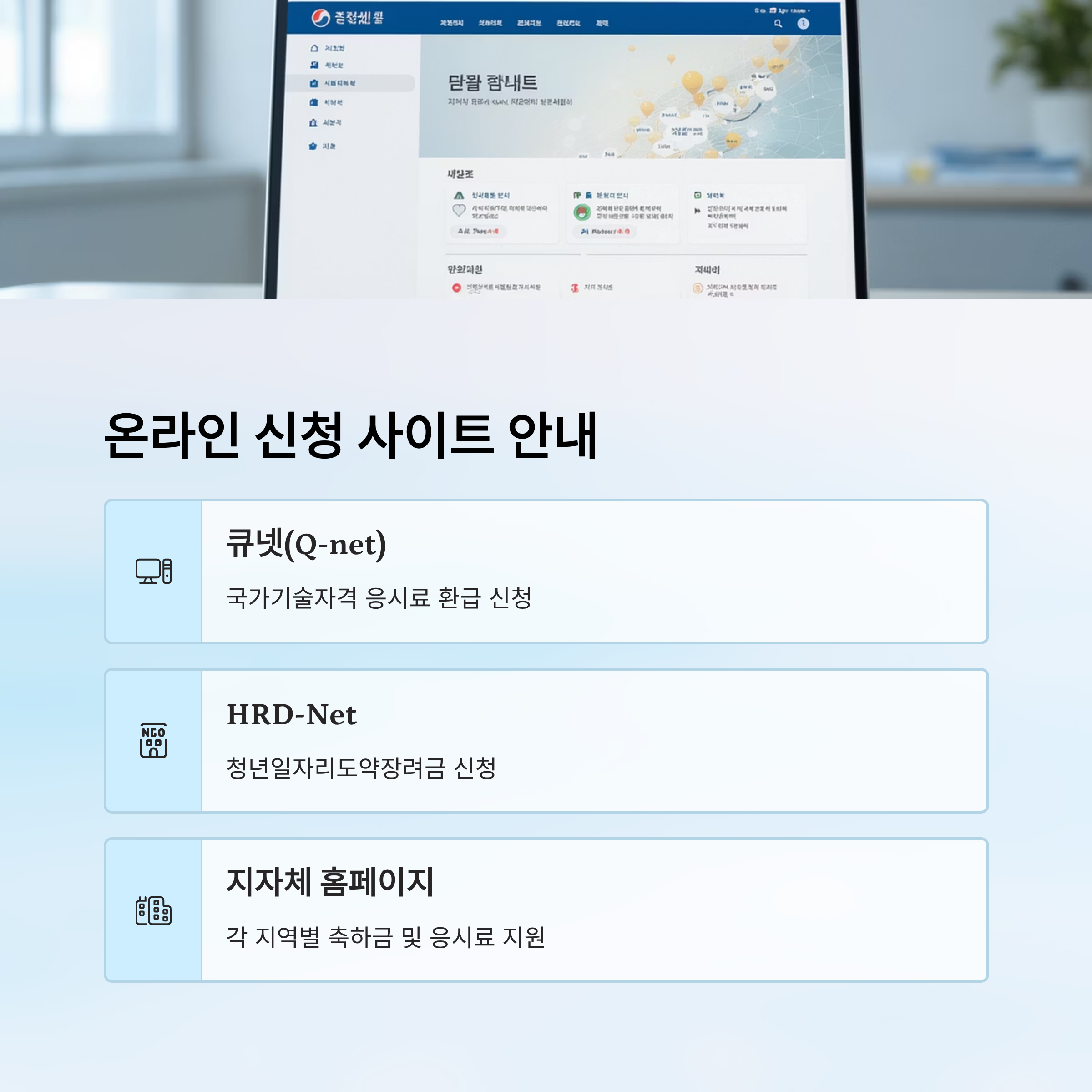 가장 대표적인 사이트는 국가기술자격시험을 주관하는 ‘큐넷(Q-net)’이에요. 여기서는 일부 자격증 시험 응시료 환급을 직접 신청할 수 있어요. 또한 중앙정부가 운영하는 고용노동부 ‘HRD-Net’이나 ‘고용24’에서는 청년일자리도약장려금 등 주요 정책 신청이 가능하죠.