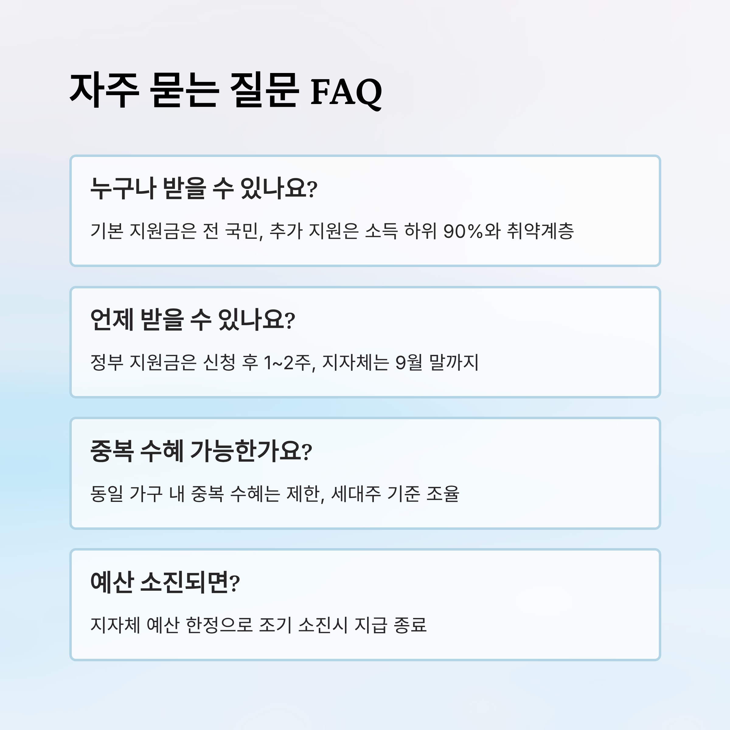 A6. 아니요, 동일 가구 내 중복 수혜는 제한돼요. 세대주 기준으로 지급 여부가 조율돼요.