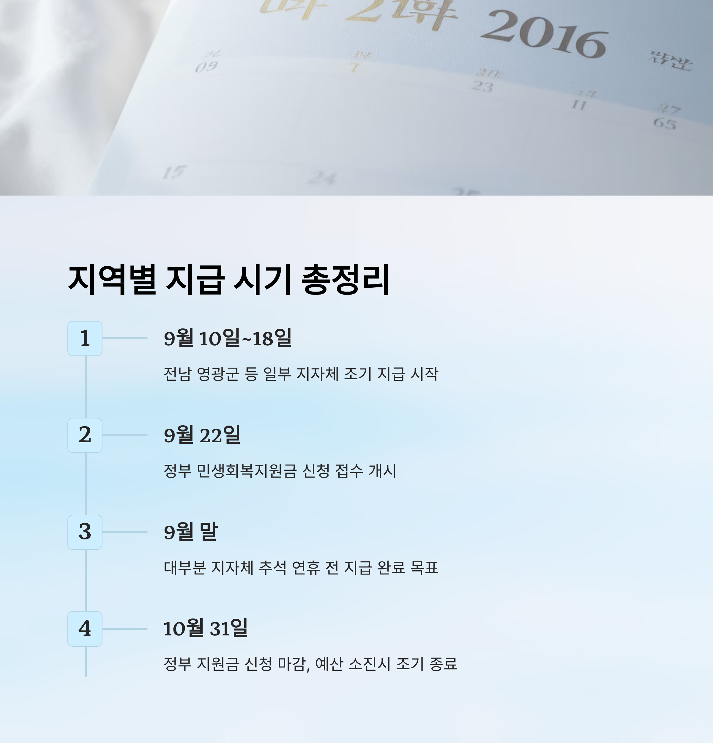 지자체별 지급은 더 빨라요. 일부 지자체는 9월 10일부터 18일 사이에 순차적으로 지급을 시작해요. 대체로 추석 연휴가 시작되기 전인 9월 말까지 지급 완료를 목표로 하고 있답니다. 예산 상황에 따라 조기 지급을 하는 곳도 있어요.