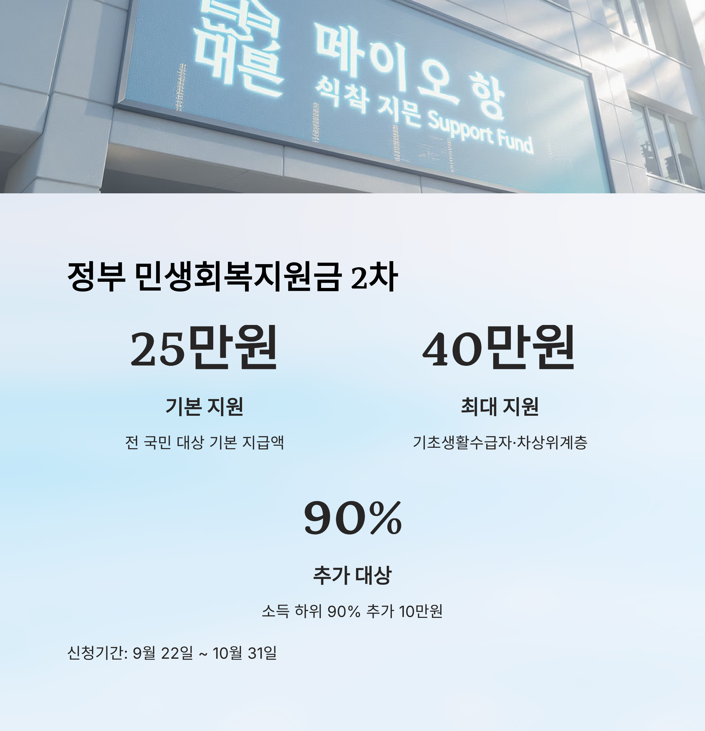 | 추가 지원 | 10만 원 | 소득 하위 90% | 온라인, 방문 | 소득 확인 필요 |