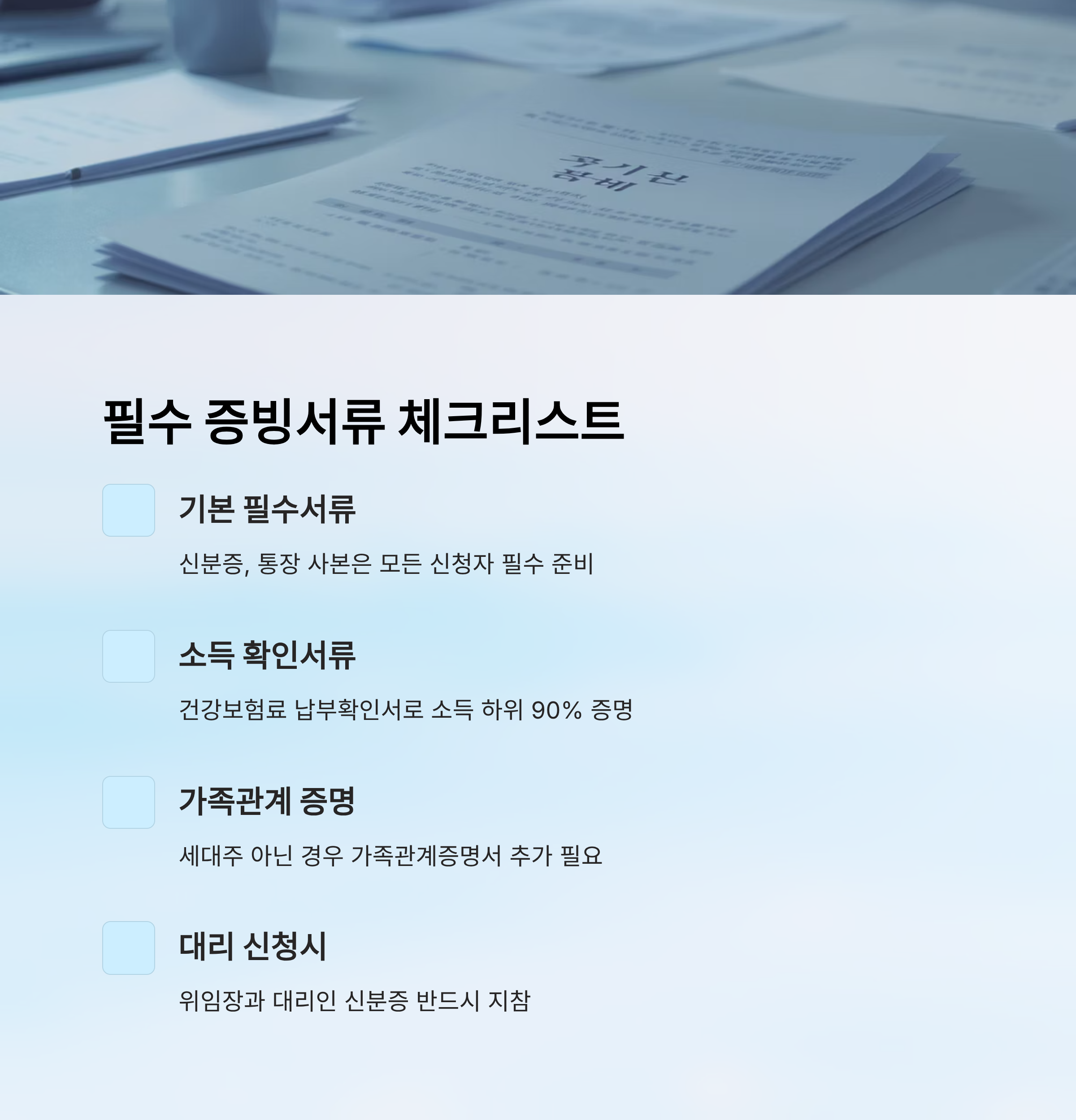 또한 장애인 등록증이나 수급자 증명서 같은 추가 증빙은 해당되는 사람에게만 요구돼요. 하지만 이런 서류는 미리 준비해 두면 접수가 훨씬 빨라지고, 대리 신청 시에는 위임장과 대리인 신분증도 꼭 챙겨야 해요. ✔️