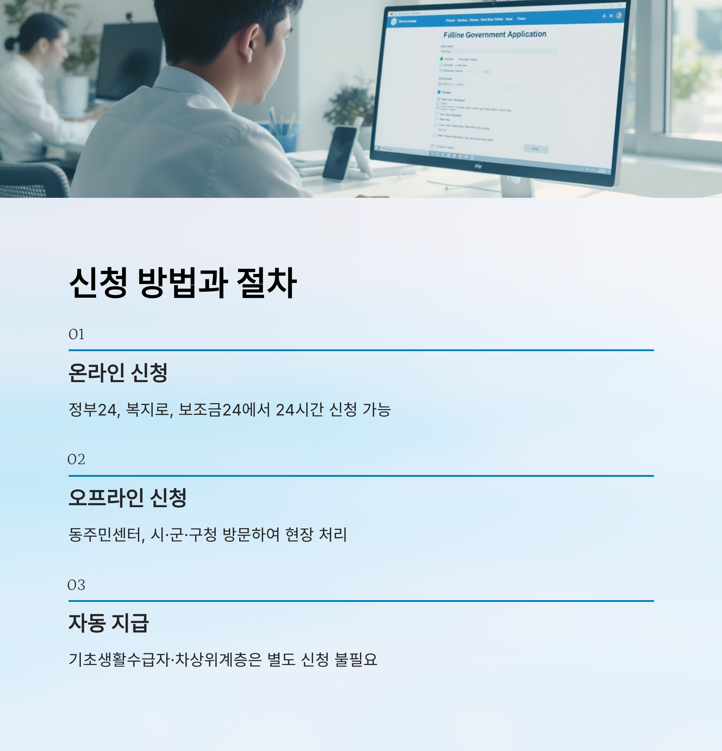 | 온라인 신청 | 정부24, 복지로, 보조금24 | 신분증 사본, 통장 사본, 스캔 서류 | 전 국민, 취약계층 | 비대면, 24시간 가능 |