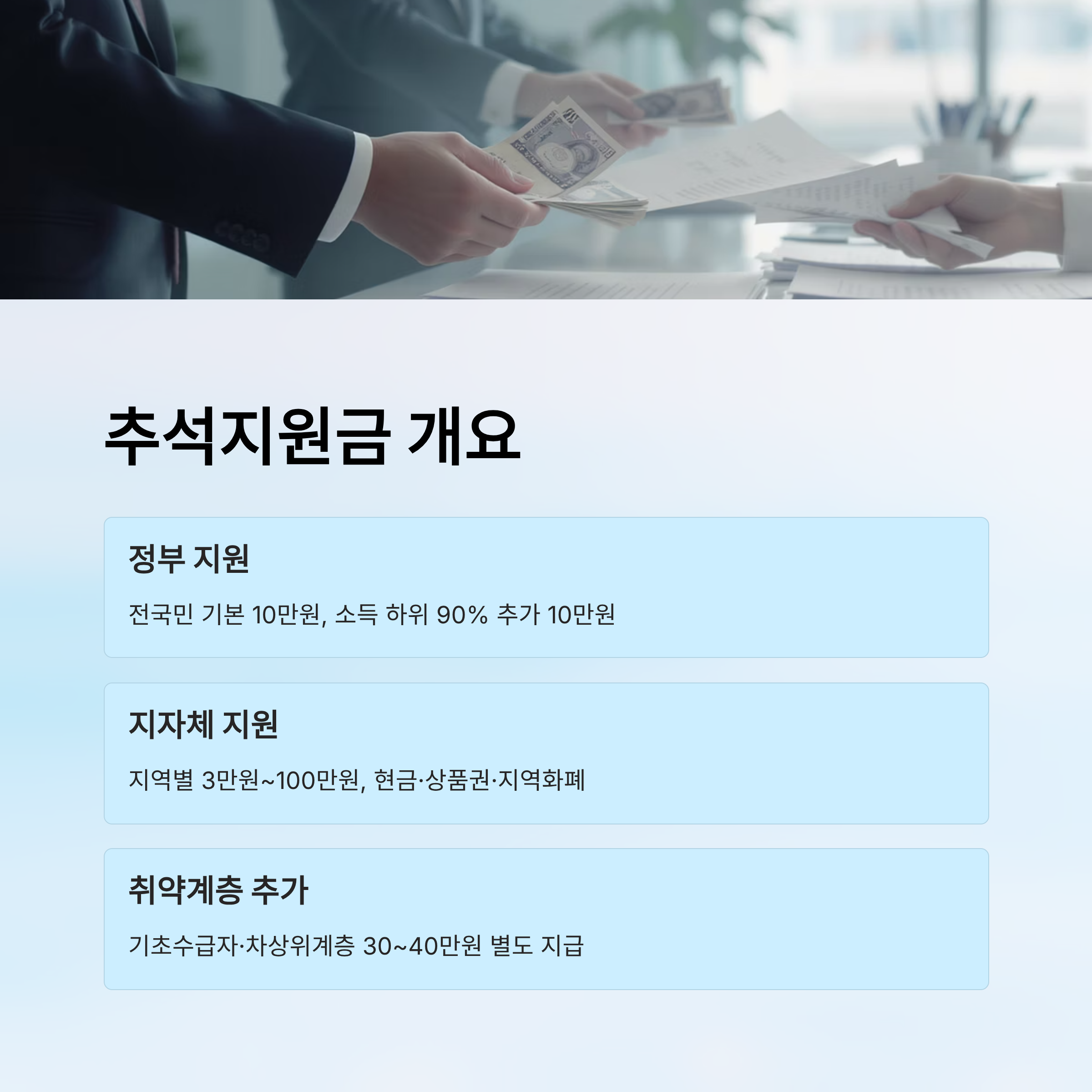 이렇게 개요를 정리해보면, 추석지원금은 정부 기본 지원과 지자체 추가 지원을 합쳐 ‘나의 상황’에 따라 받을 수 있는 금액이 달라진다고 할 수 있어요. 따라서 본인의 자격 조건을 먼저 확인하는 것이 가장 중요하답니다.