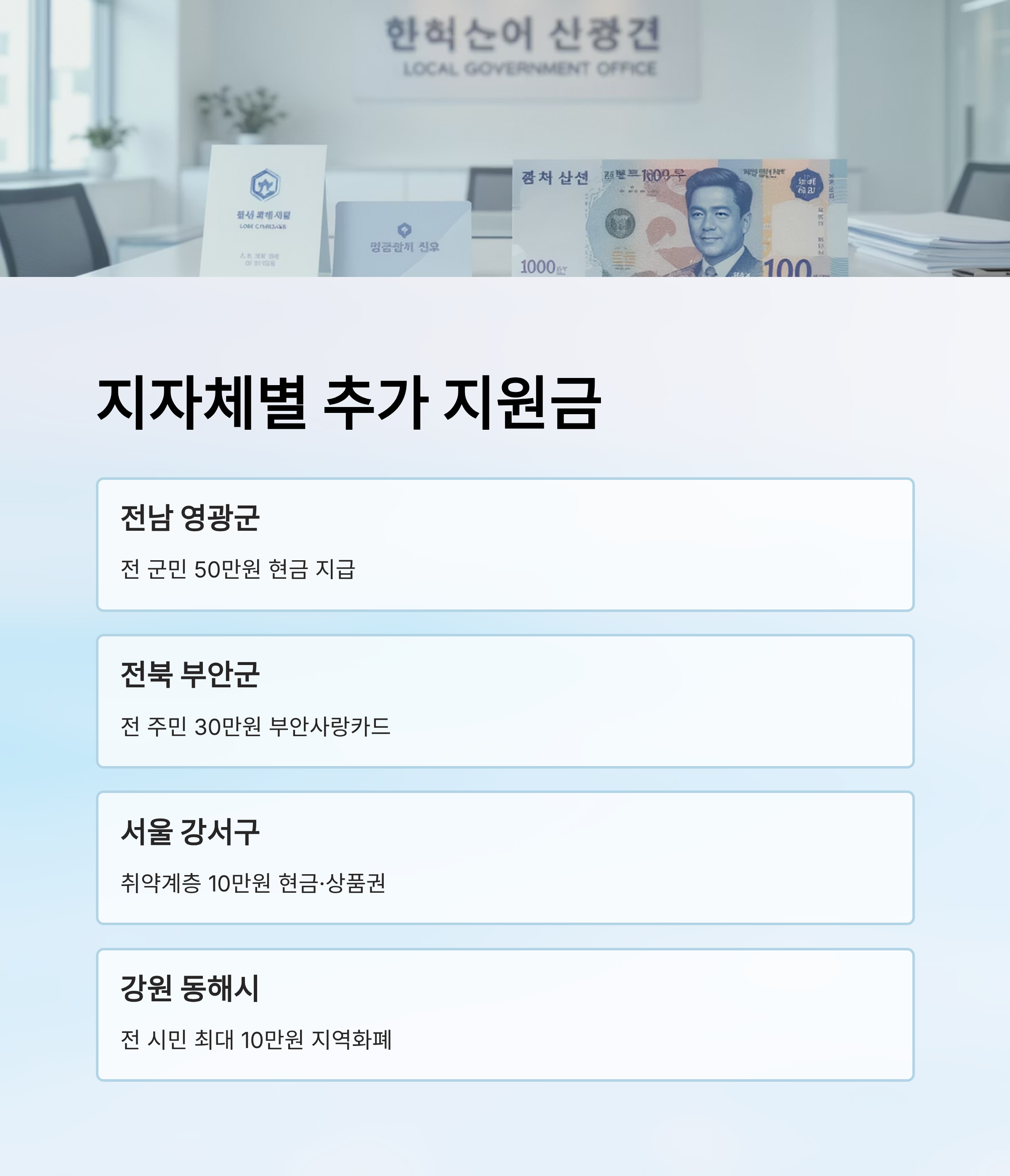 서울 강서구는 기초생활수급자 등 취약계층에게 10만 원을 지급하는데, 현금과 ‘서울사랑상품권’ 중에서 선택할 수 있어요. 부산 일부 구도 소득 기준에 따라 5만 원에서 20만 원을 추가로 지급하고 있답니다. 반면 경기도 화성시는 기초생활수급자 중심으로 현금 10만 원을 지급해요.